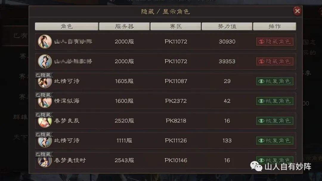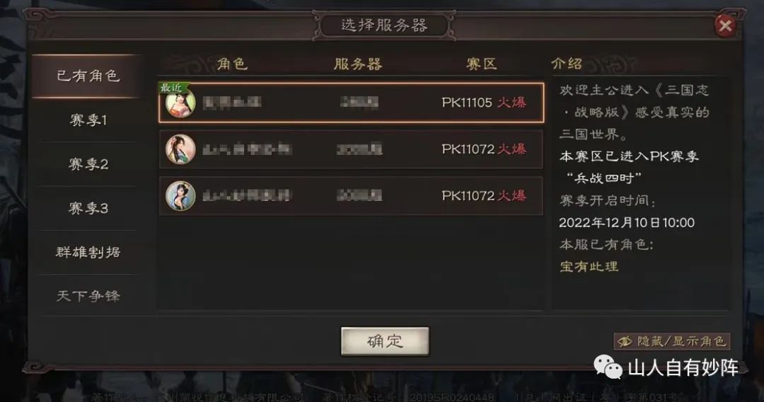 目前有一小部分玩家,喜欢跑区,只玩第一赛季,他们表示第一赛季武将少,不用开兵书,不用各种事件战法,是最简单最纯粹的三战玩法,所以他们玩一个S1赛季后,就不在进S2玩,而是再跑一个新区继续玩S1,依次类推,乐此不疲。慢慢的登陆账户页面就会出现一大堆区服角色,现在出现隐藏功能后,就可以把以前不玩的区服直接隐藏掉了。