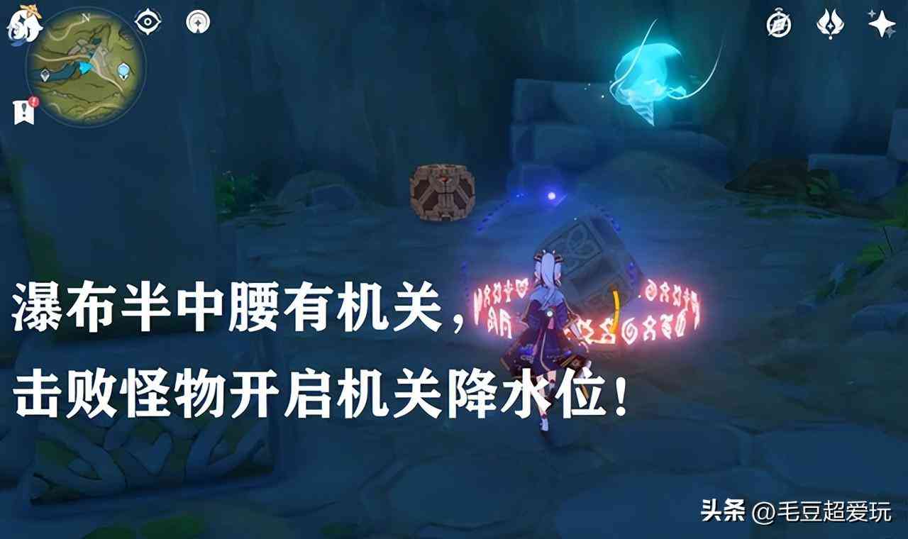 仙灵、机关和怪物都在半中腰,这里的机关是锁着的,需要击败怪物才能开启机关,仙灵可以不用管它,和这次的解谜是没有关系的,开启开关之后水位会下降,我们就可以走进山洞继续探索了。
