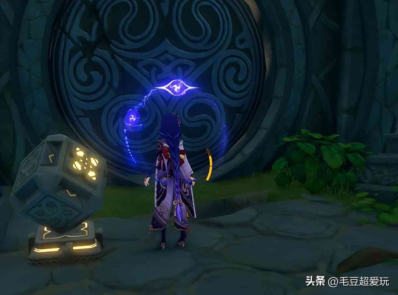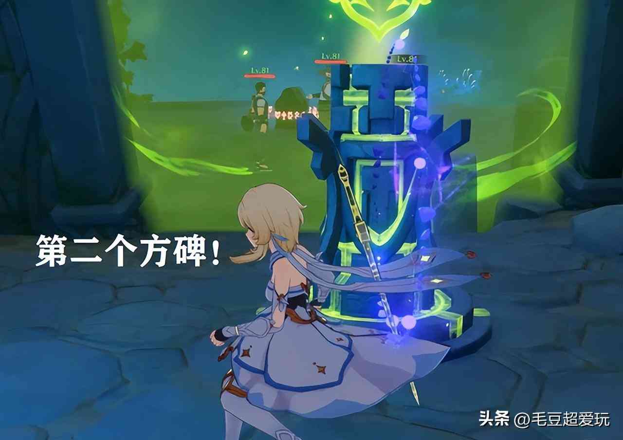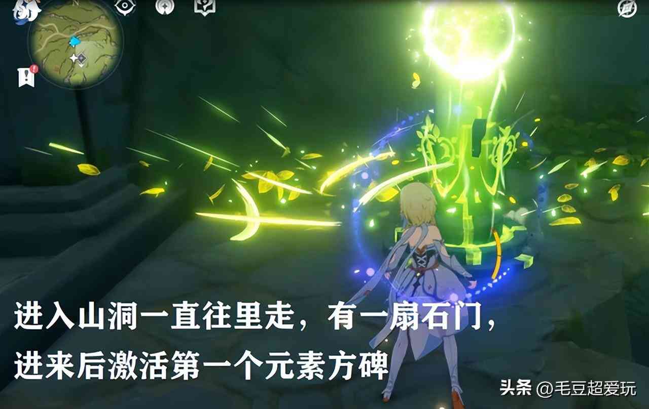 进入山洞后就一直向前走,直到视野变得开阔,再走几步就会看到一个类似石门的东西,走进去就能看到第一个元素方碑,用草元素激活即可。