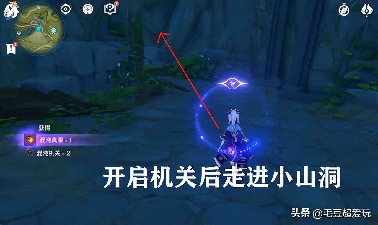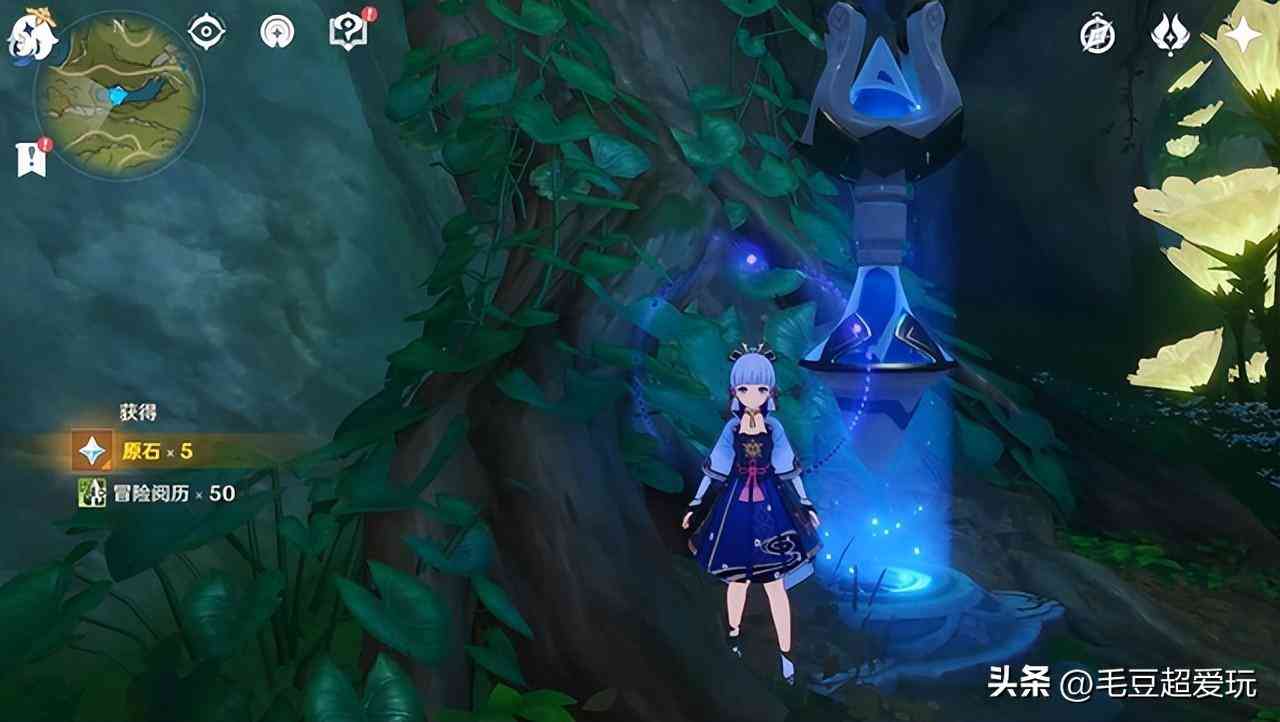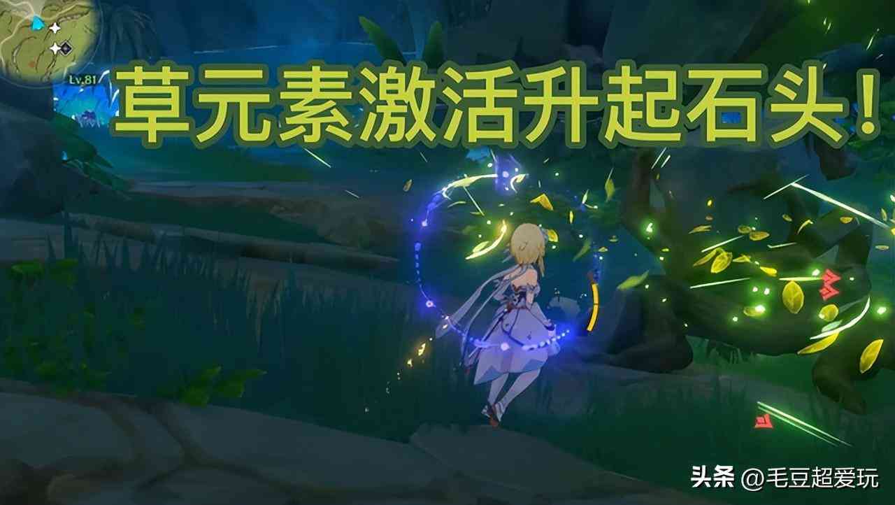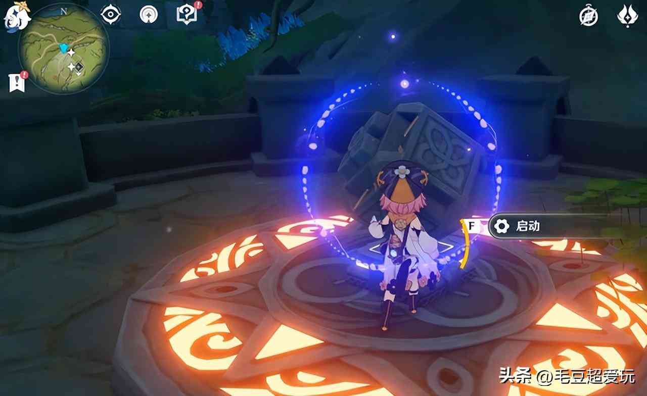 进入山洞后就一直向前走,直到视野变得开阔,再走几步就会看到一个类似石门的东西,走进去就能看到第一个元素方碑,用草元素激活即可。