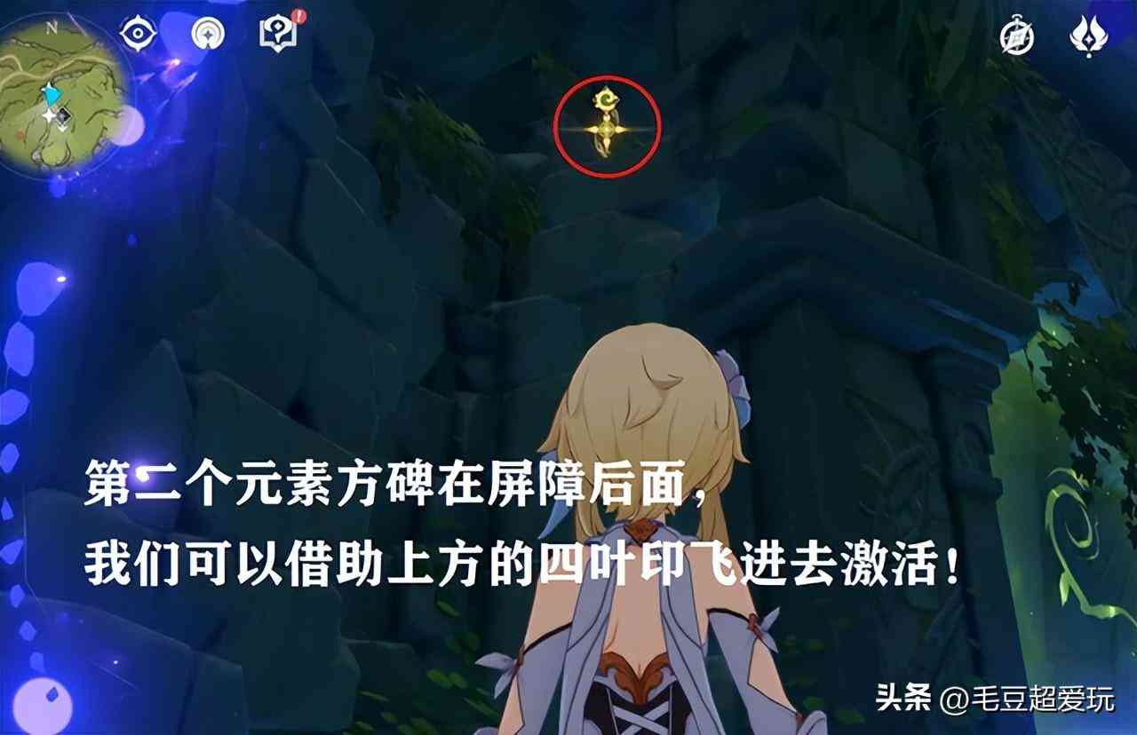 第二个元素方碑在屏障后面,屏障是不需要我们解谜的,只需要借助后方的四叶印飞进去即可,接着激活元素方碑屏障自然而然就解开了。