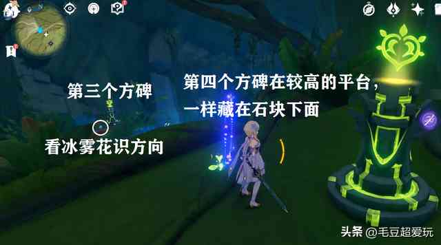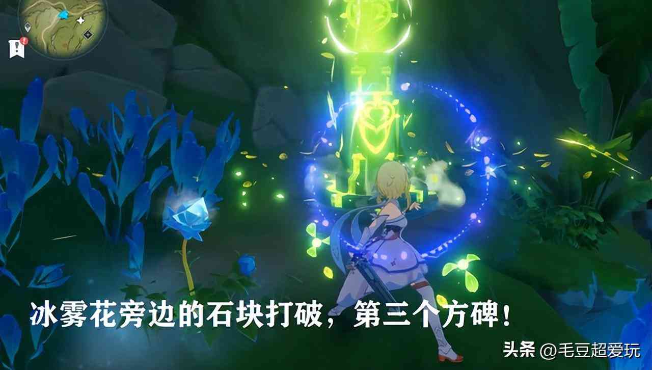 从屏障出来以后就一直往前走,飞过一个小水坑就会看到一个被藤蔓包裹的石块,这里用草元素激活一下可以拿到草种子,接着视角朝向左边可以看到一朵冰雾花,花旁边的石块用草种子击碎,就可以看到第三个元素方碑了。