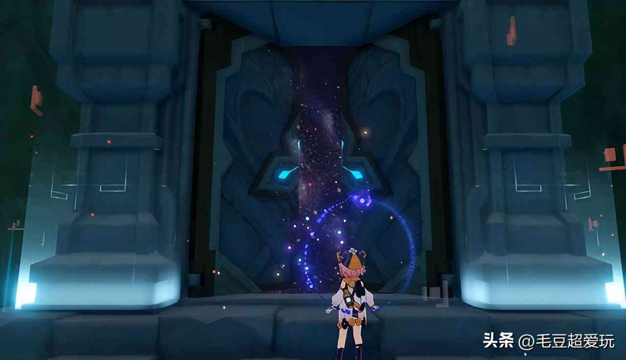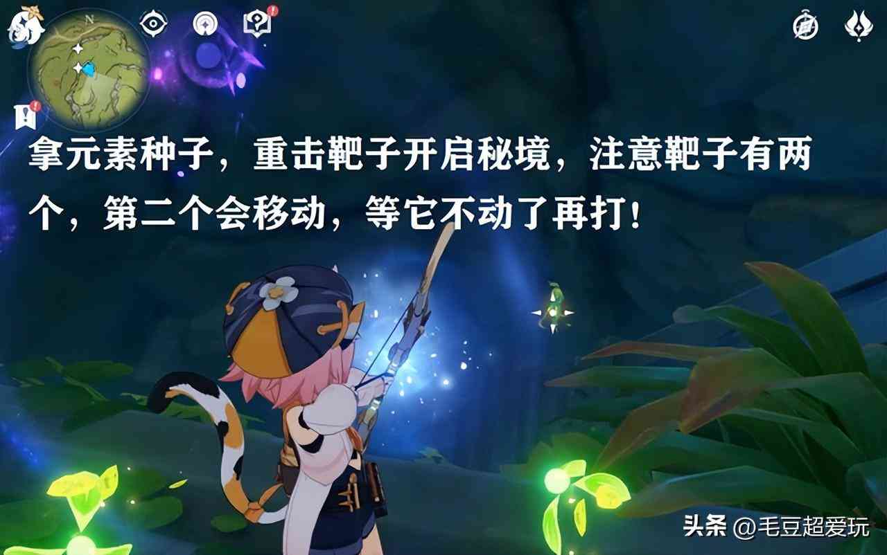 下来后击败怪物会开启石门,石门后面只有一条路,非常好找,一直走到深坑的地方,向下跳可以看到一个草种子,之后我们拿到草种子切出弓箭角色,利用重击击中两个靶子就可以解锁“童梦的切片”秘境了!