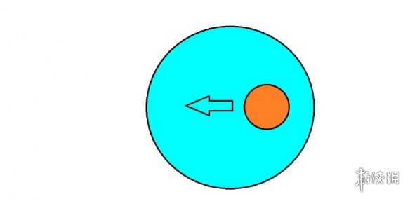 如图所示,橙点即为对方,而且箭头是对方的前进方向,整个青蓝色的圈即为你的攻击范围,打在这种位置是最合适的。如果对方的移动速度过快则需要将攻击范围向对方所移动的那个方向进行合适的调整。