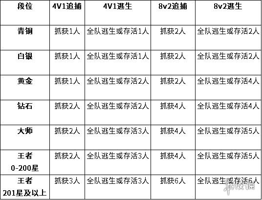 1、调整后,是否获得段位积分将只由玩家当局全队逃出+存活人数/抓获人数决定,让玩家的升段目标更清晰,想要上分的玩家在结算时就能够明确知道自己这局比赛有没有加分(具体加分规则将在游戏结算界面进行说明);
