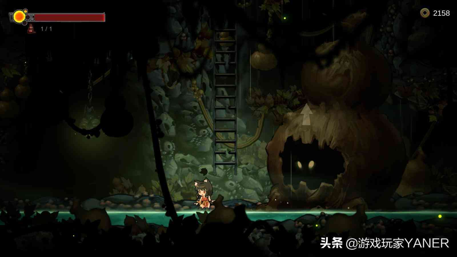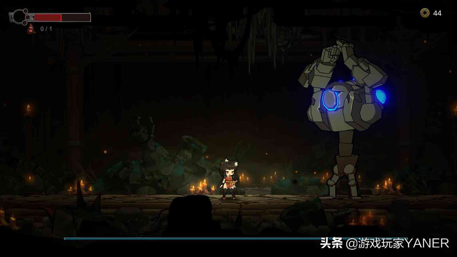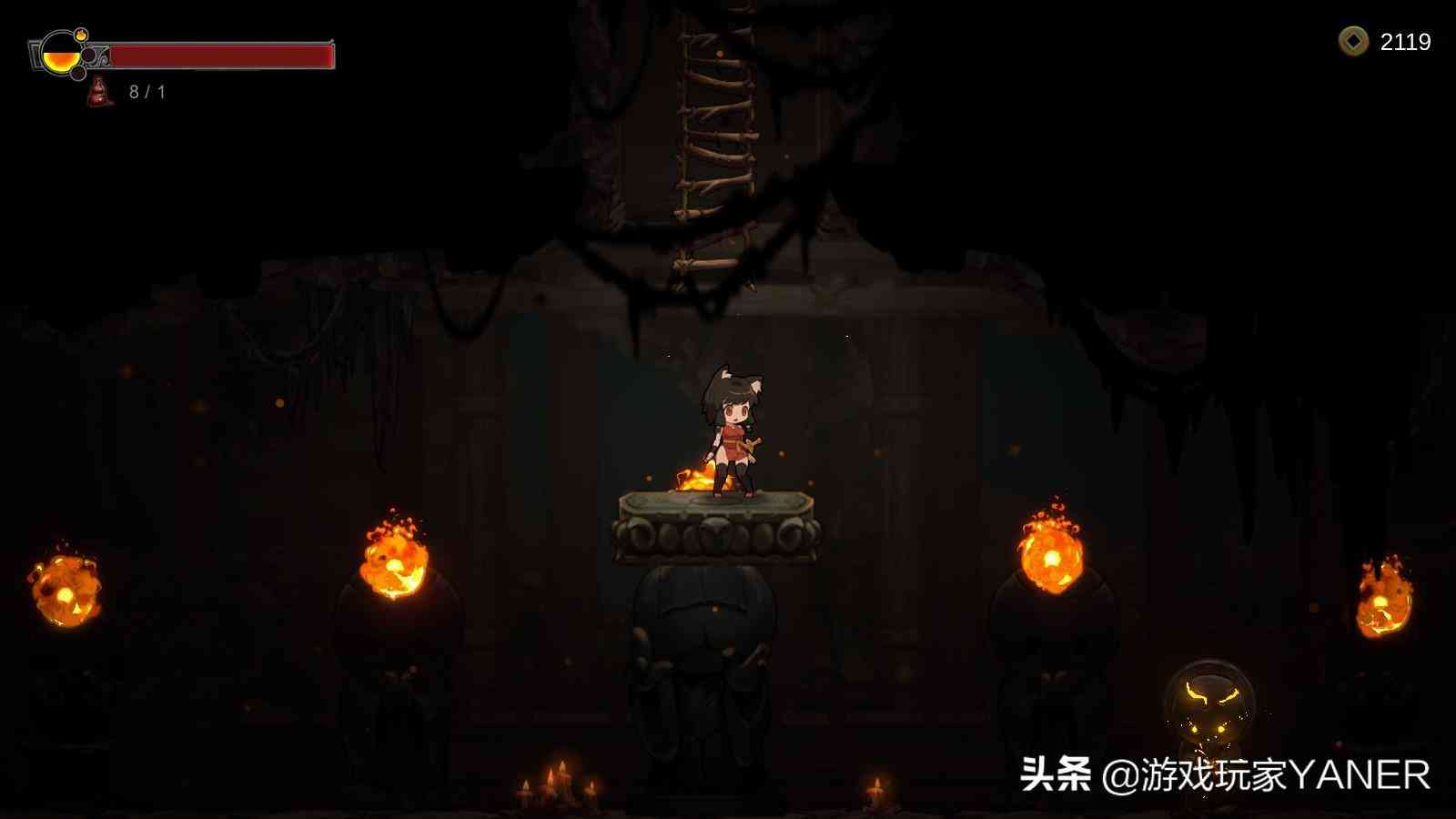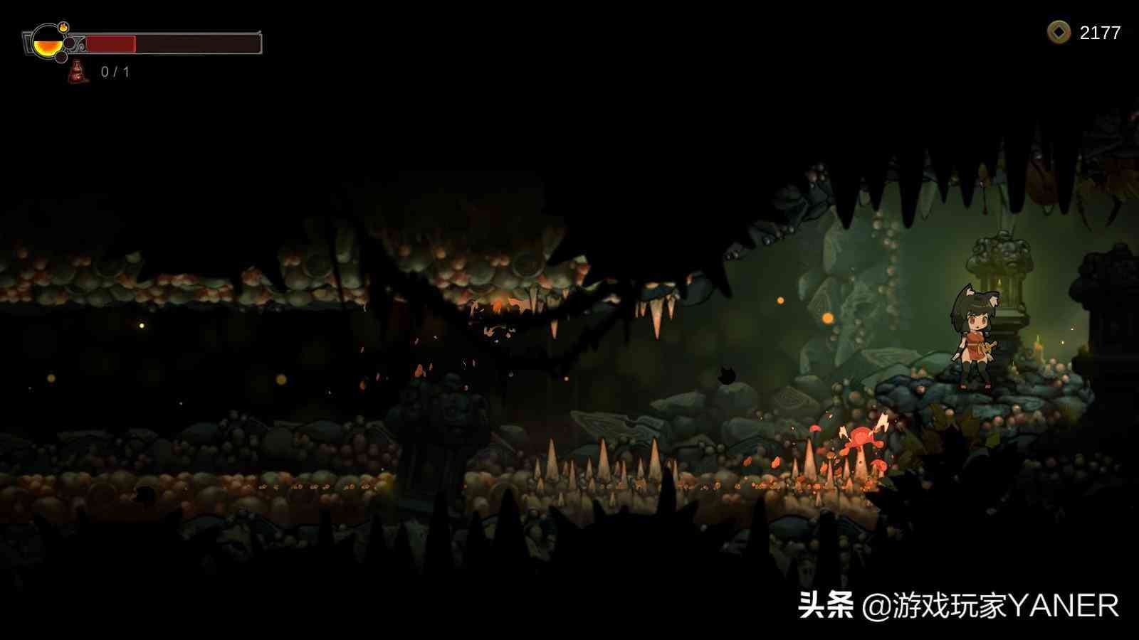 本作的画风采用了卡通手绘的形式来表现,有着良好的场景效果展现,比如滴落水滴的洞穴,风雪飘落的大门等等。主人公看上去像一个猫娘,给了我一种日系武士少女的感觉,腿部看起来也肉肉的,且有着十分丰富的动作表现,移动,从高处落下,悬挂或者攀爬等等,配合音效渲染了不错的游戏氛围。