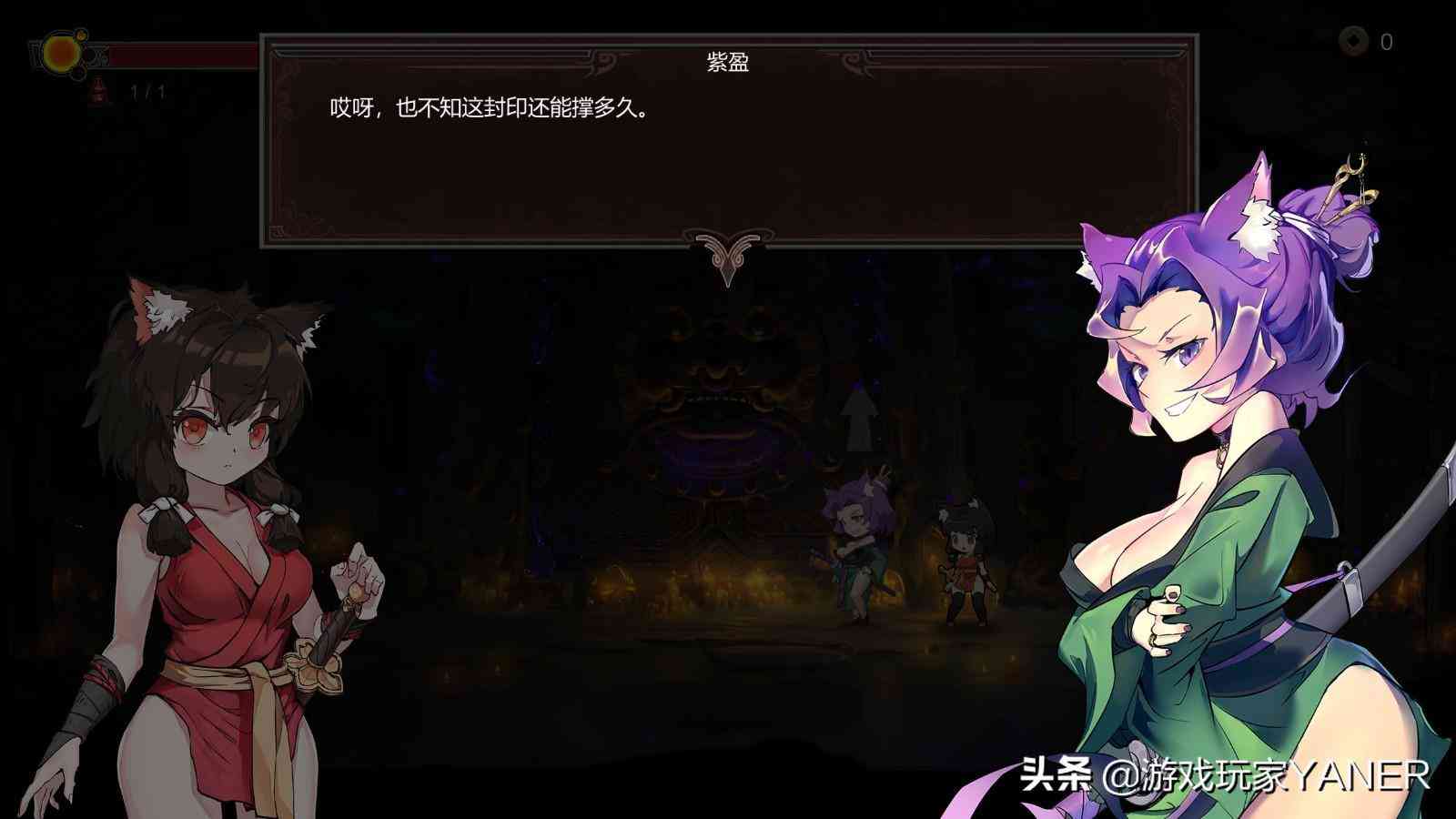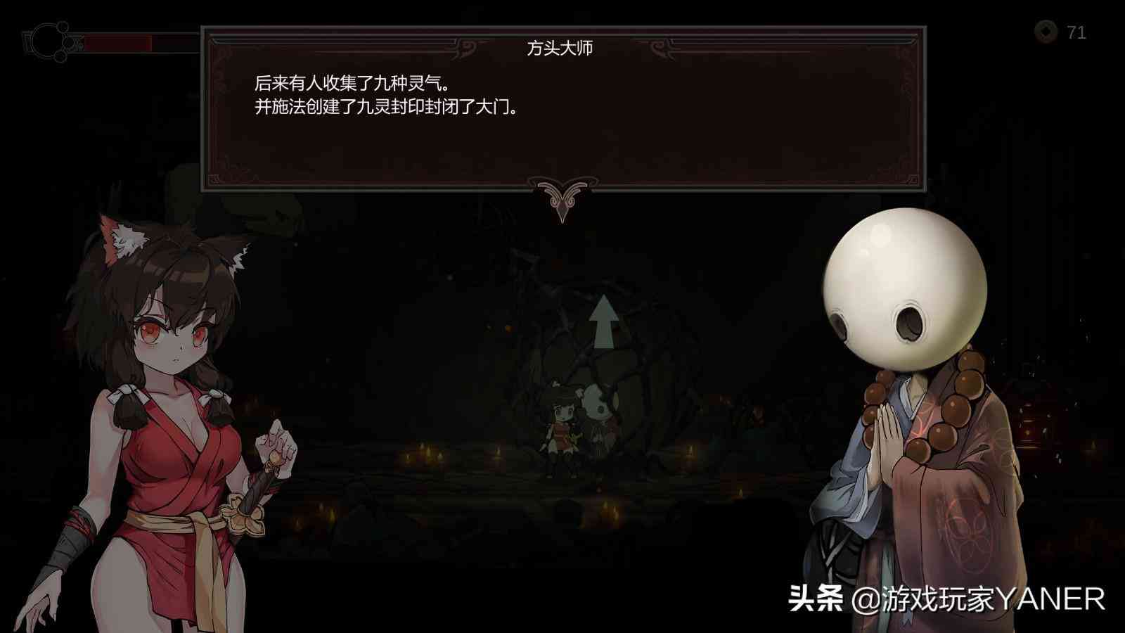 地图也采用了类似恶魔城的形式,设计了暗道机关,左右都可以走动,可以在地图查看未探索的地方,陷阱和怪物等等,特定的地点不能打开。游戏是有着一定剧情的,比如第一个我们到达的地方叫九灵寺,方头方丈可以在我们收集到绳结后帮我们进行升级,让我们能佩戴更多的宝具。