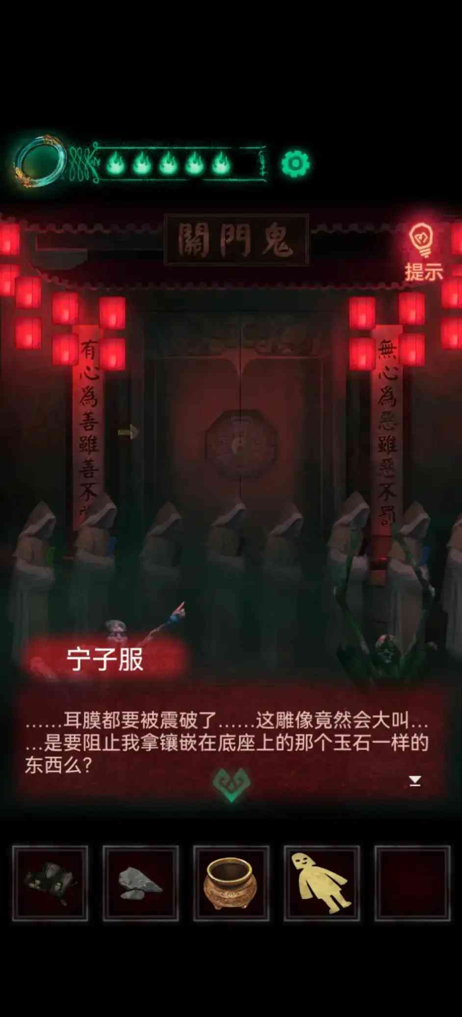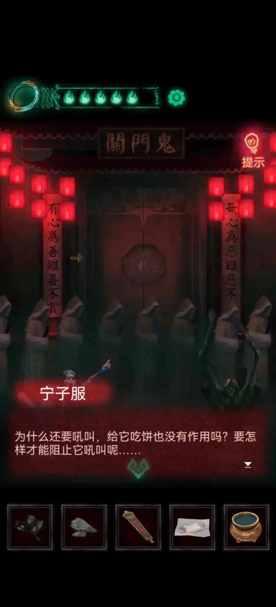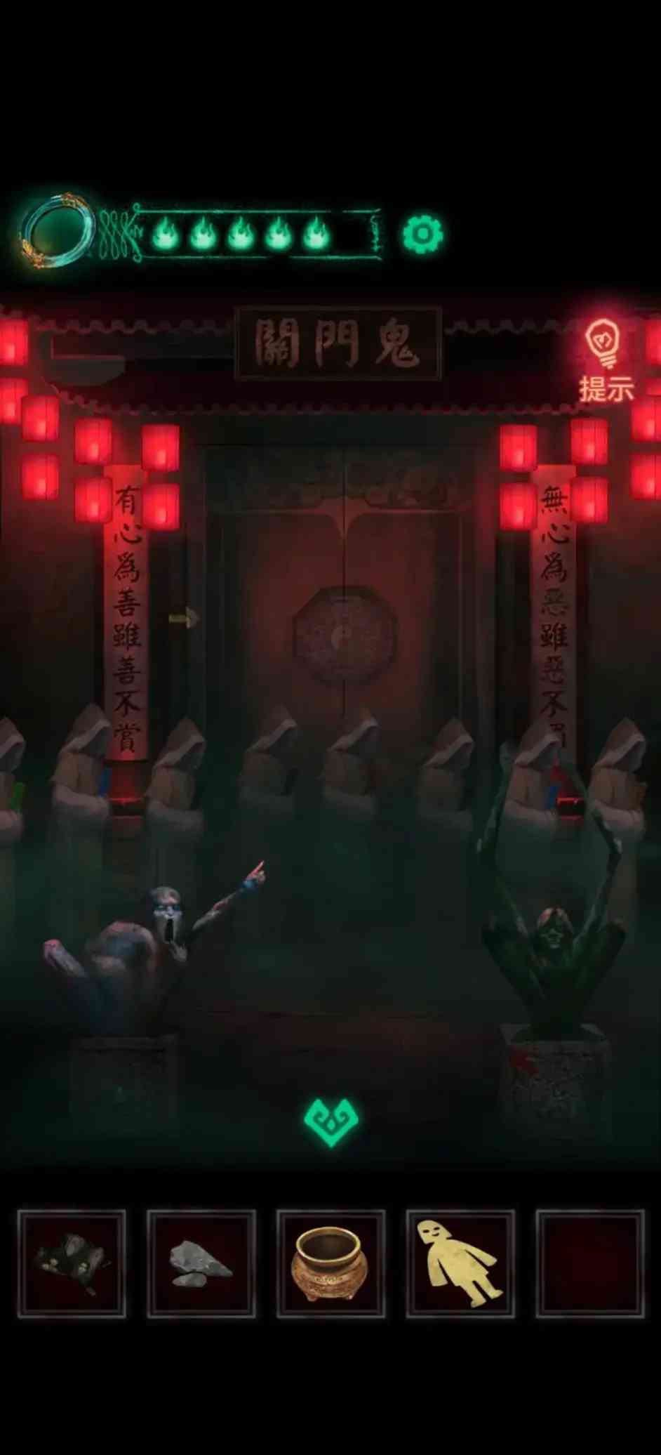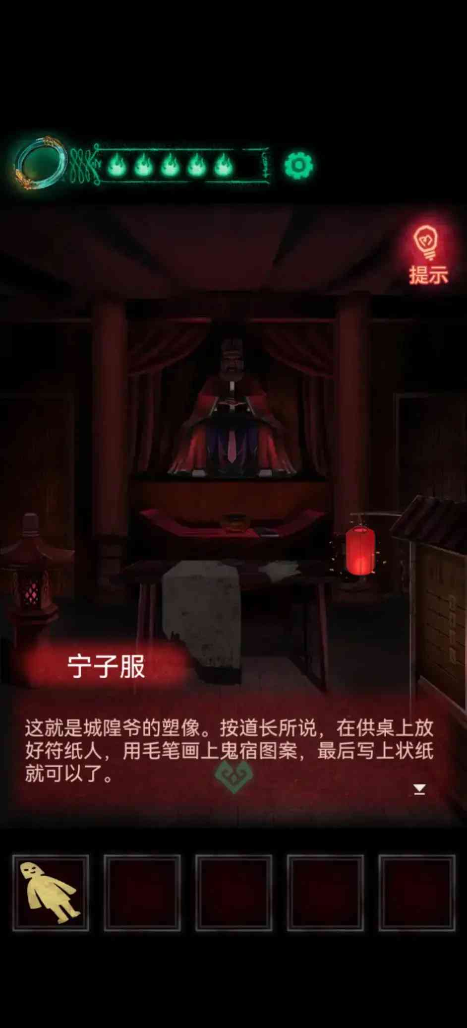 进屋会提示步骤:供桌放符纸人,用毛笔画鬼宿图案,写状纸,总之先把雕像旁边灯笼拿走,退出来把灯笼挂上。