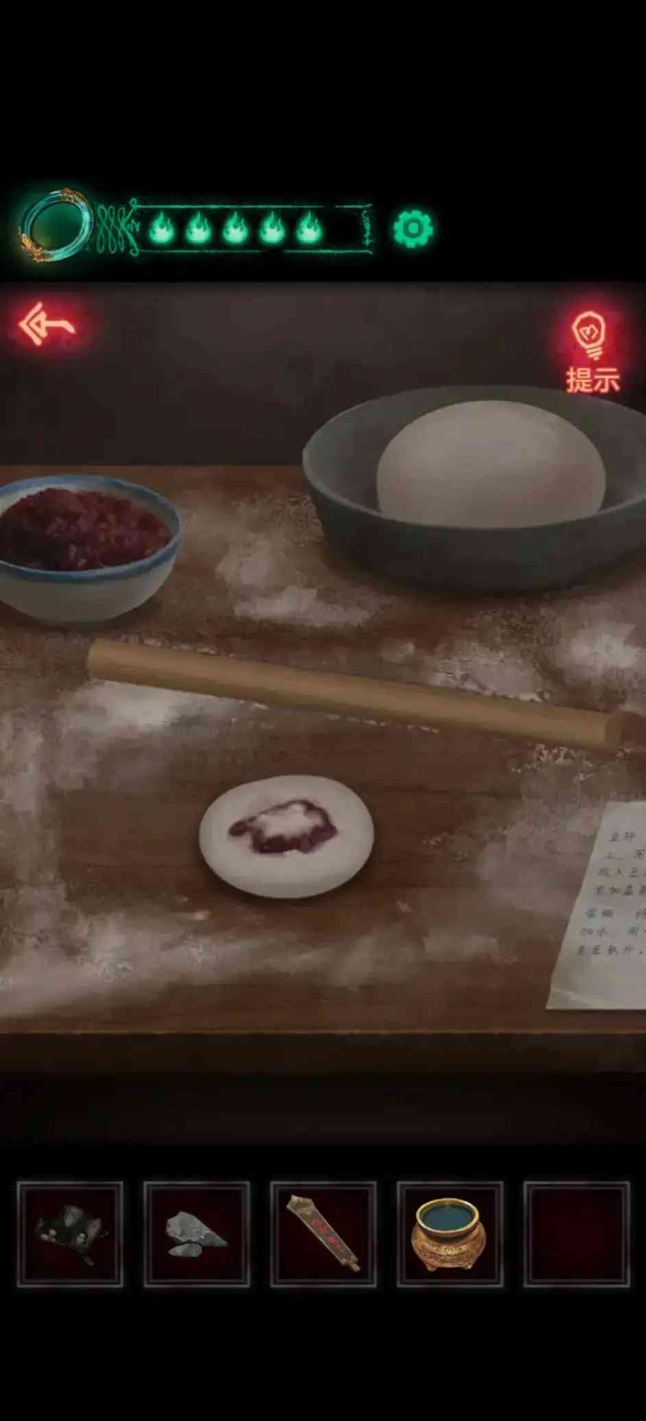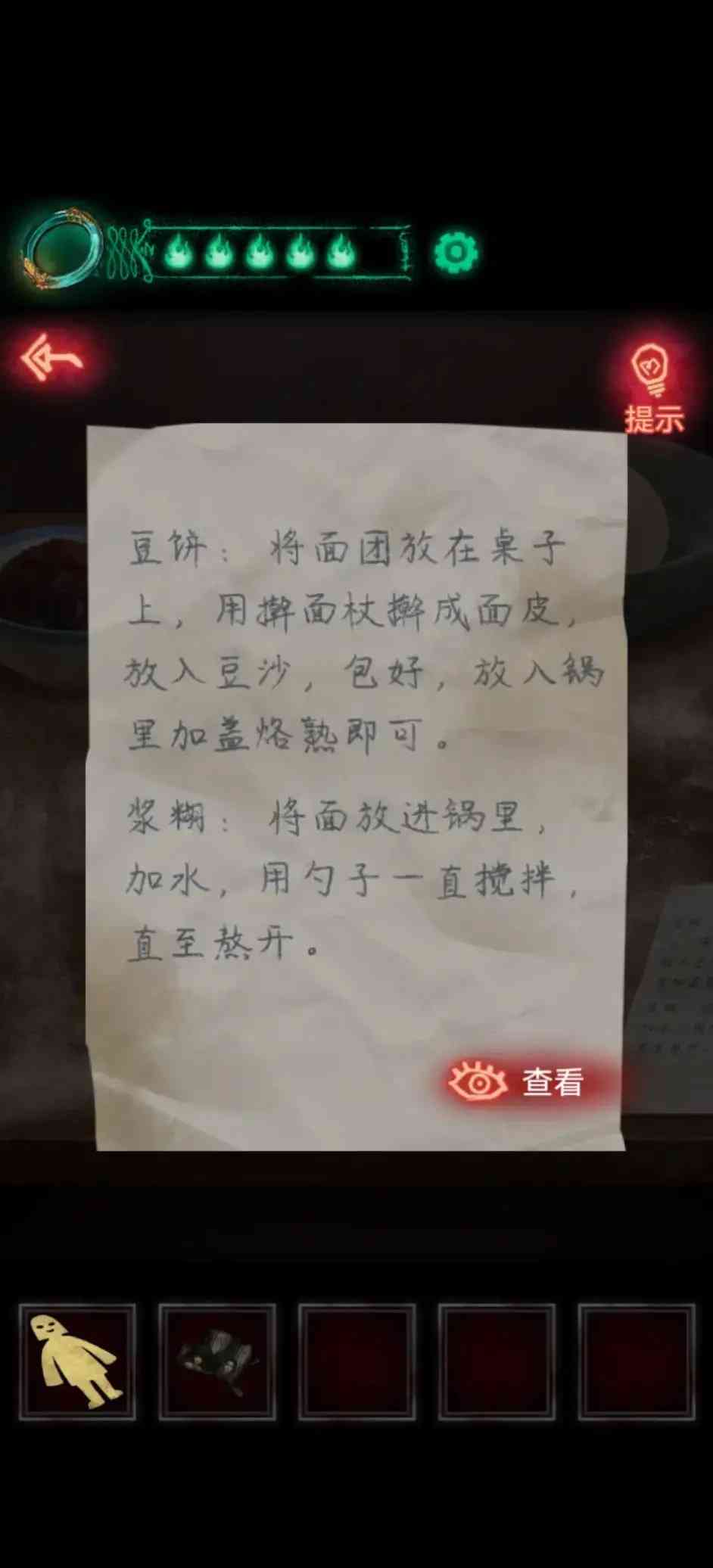 先退回第一个场景,黑无常的哭丧棒就是擀面杖了,舀水和面把豆包和浆糊各做一份,豆包就是取面-放面-擀面-放豆沙-包起来-放锅里-盖盖,浆糊就是取面-取水-放锅里-勺子搅,对了做之前要先用燧石打火哦,完成后手里应该有豆包、浆糊各一。