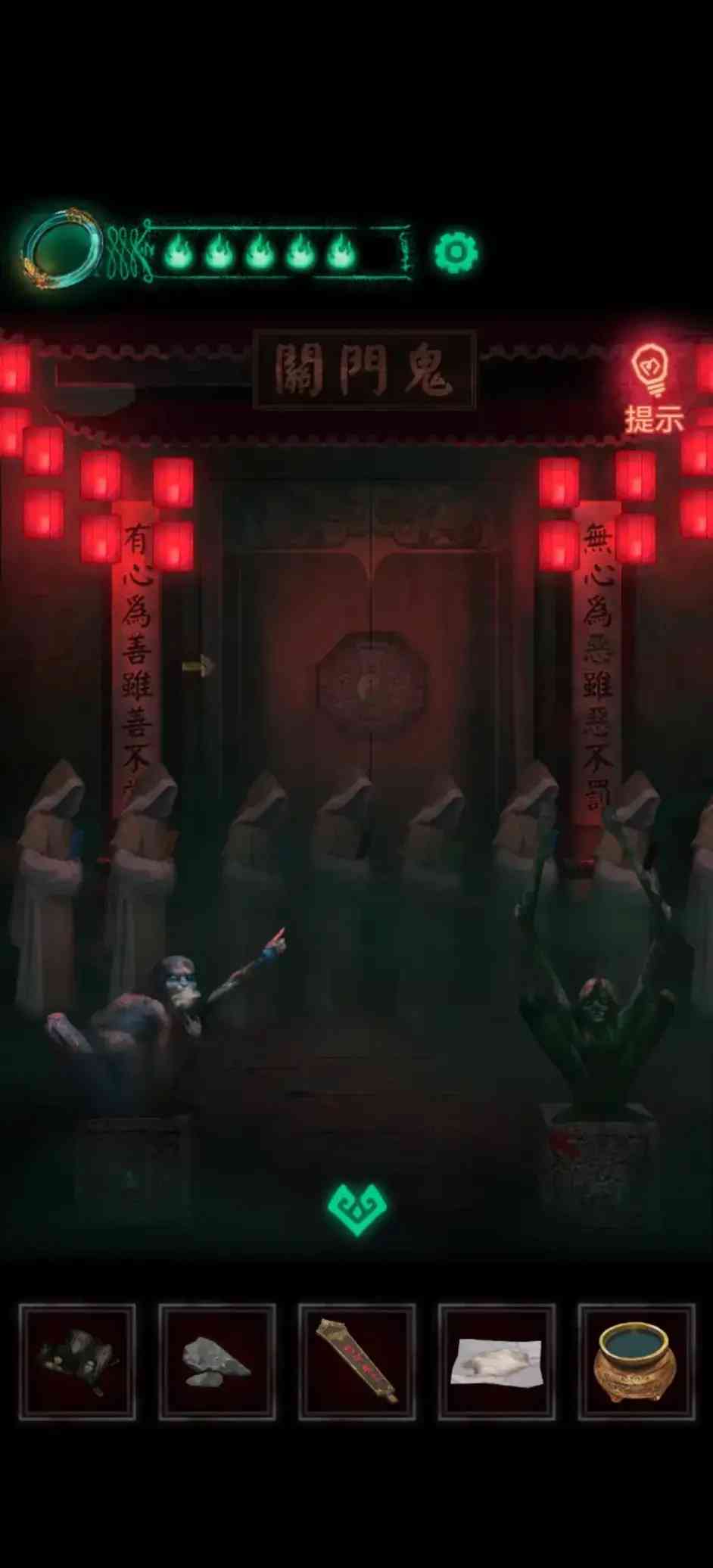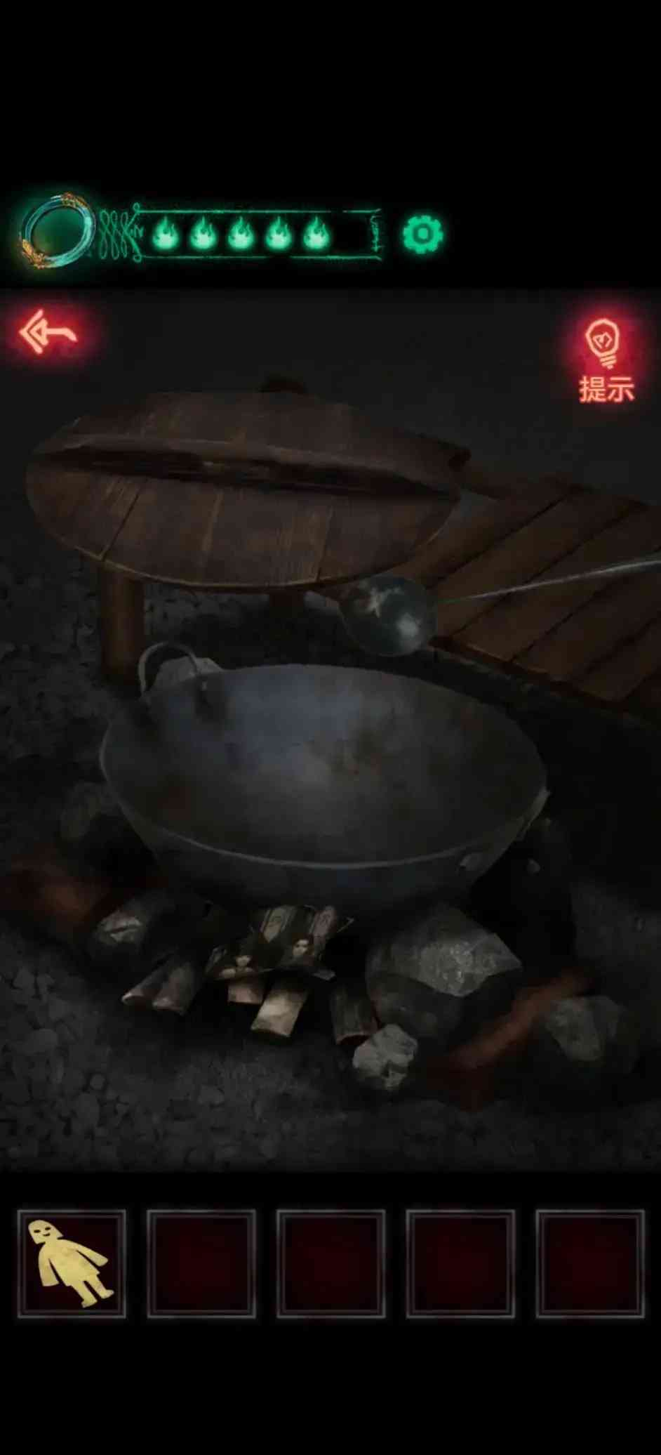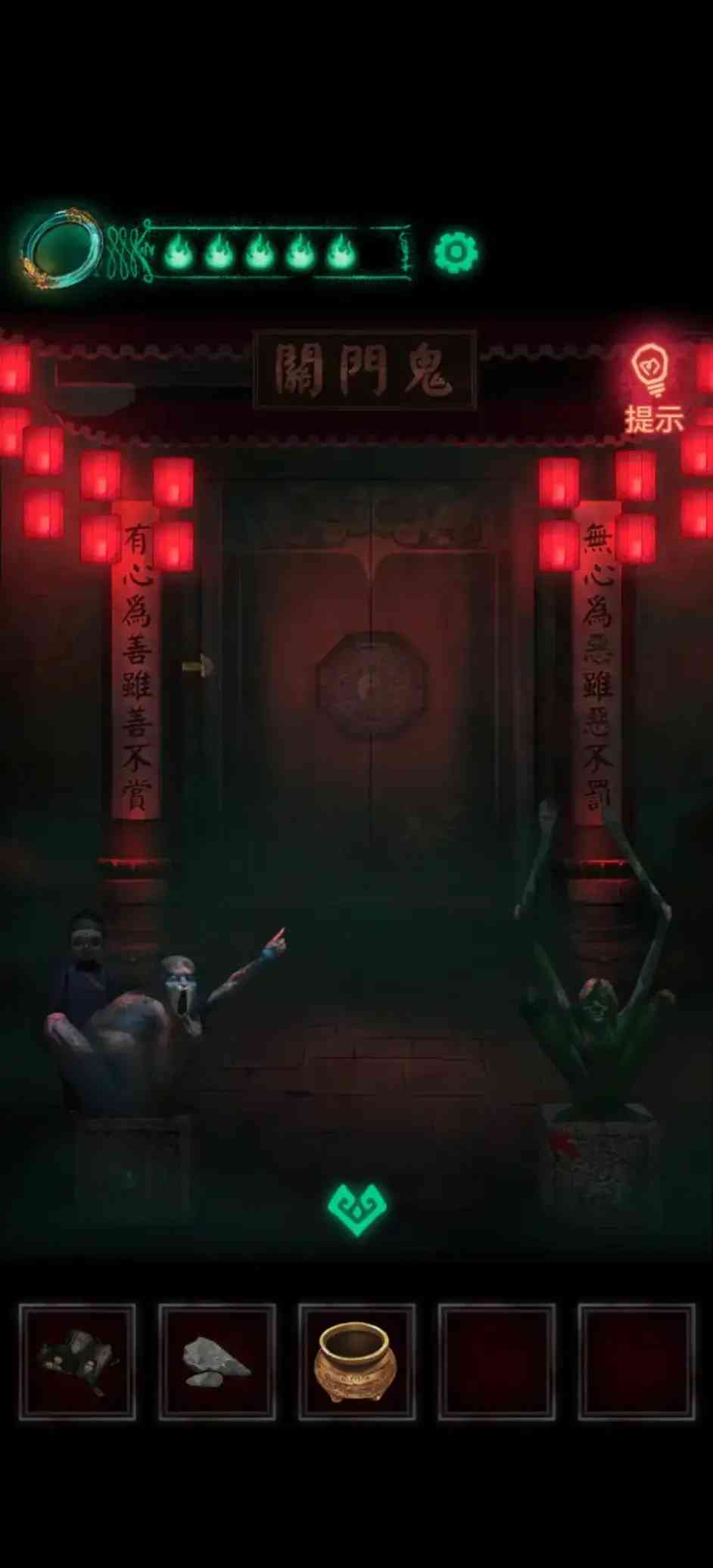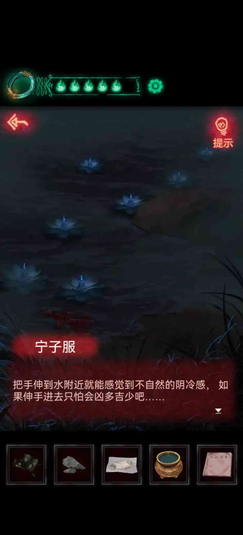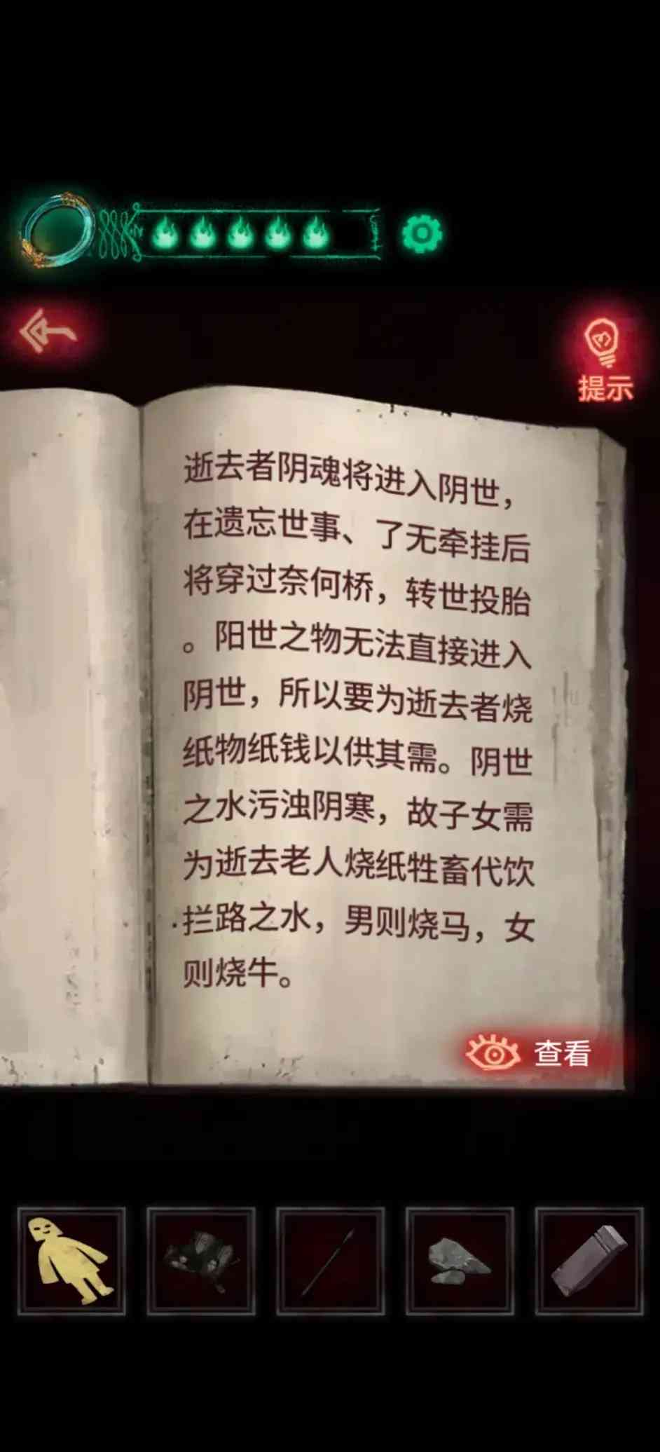 进门后往前走就来到阴间了,首先吧地上图谱捡起来,还有丈母娘怀里的白色皮影,然后点河水看到红色皮影,既然不能伸手自然是要找东西舀出来了。