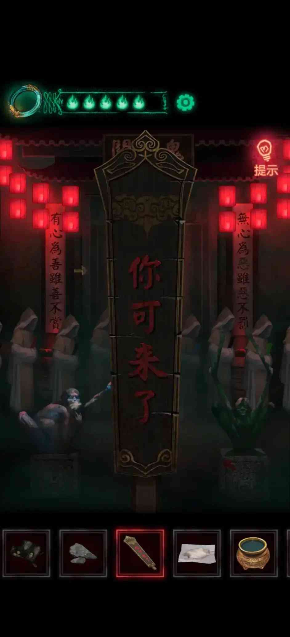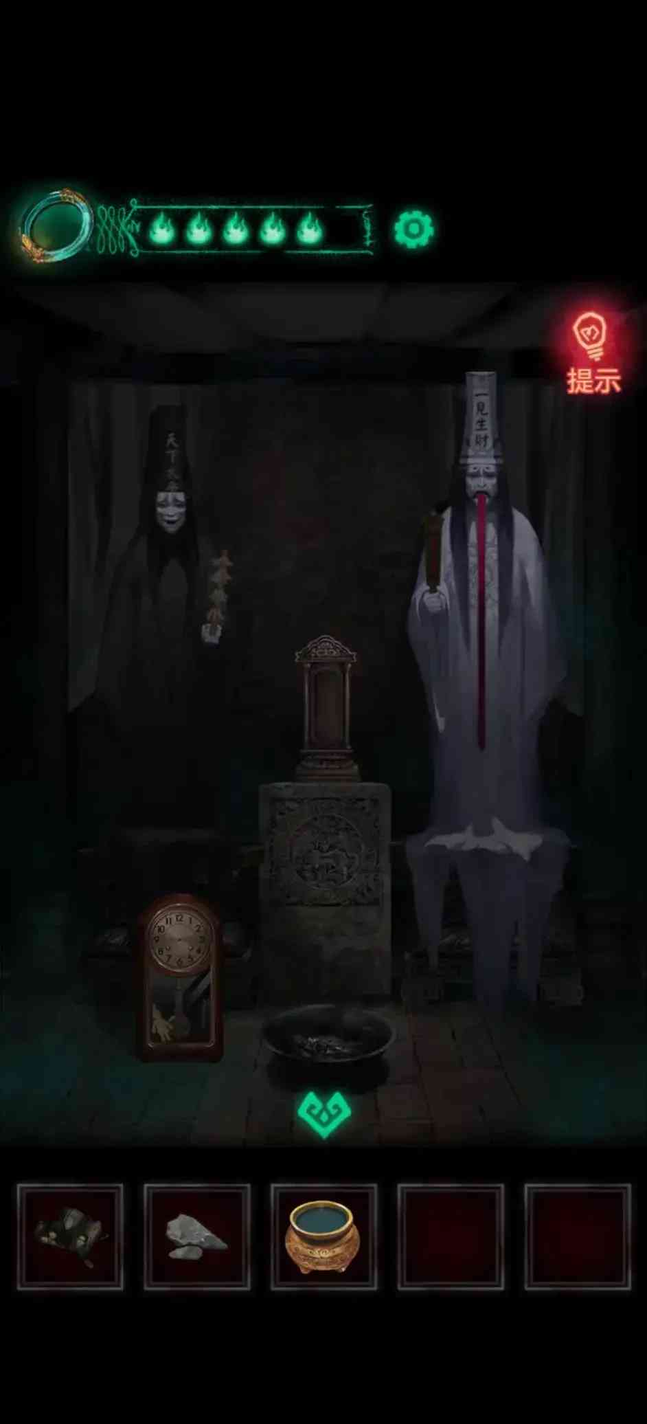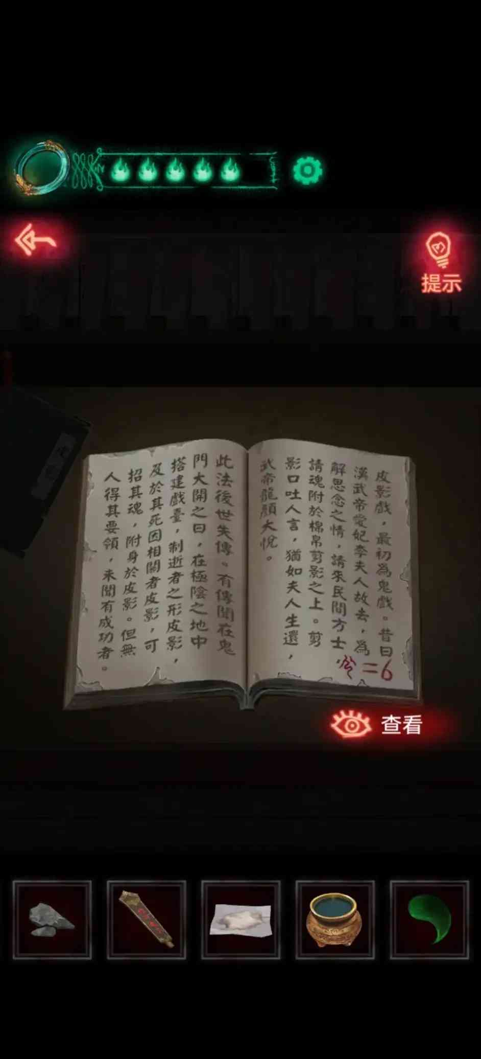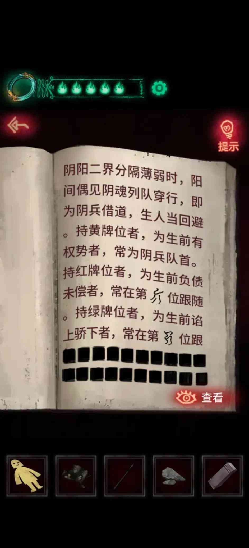 总之先拿起地上小方块,右边的告示板道具就齐了,结合刚刚我们推断的黑无常=水,白无常极=火,阎王=木,牛头=土,马面=金把木块调整好,之后机关打开露出后面皮影戏场景,左边书上写着“兮”=6。