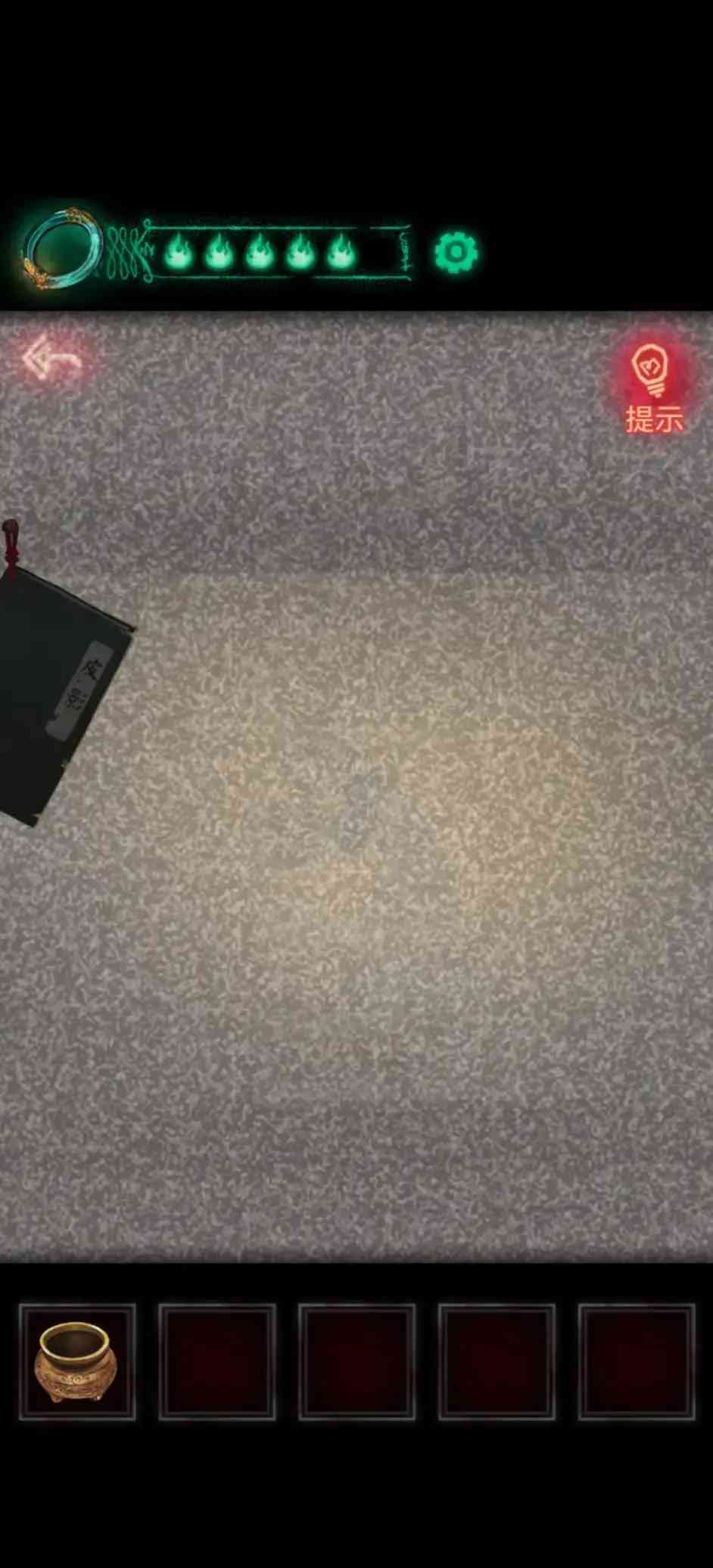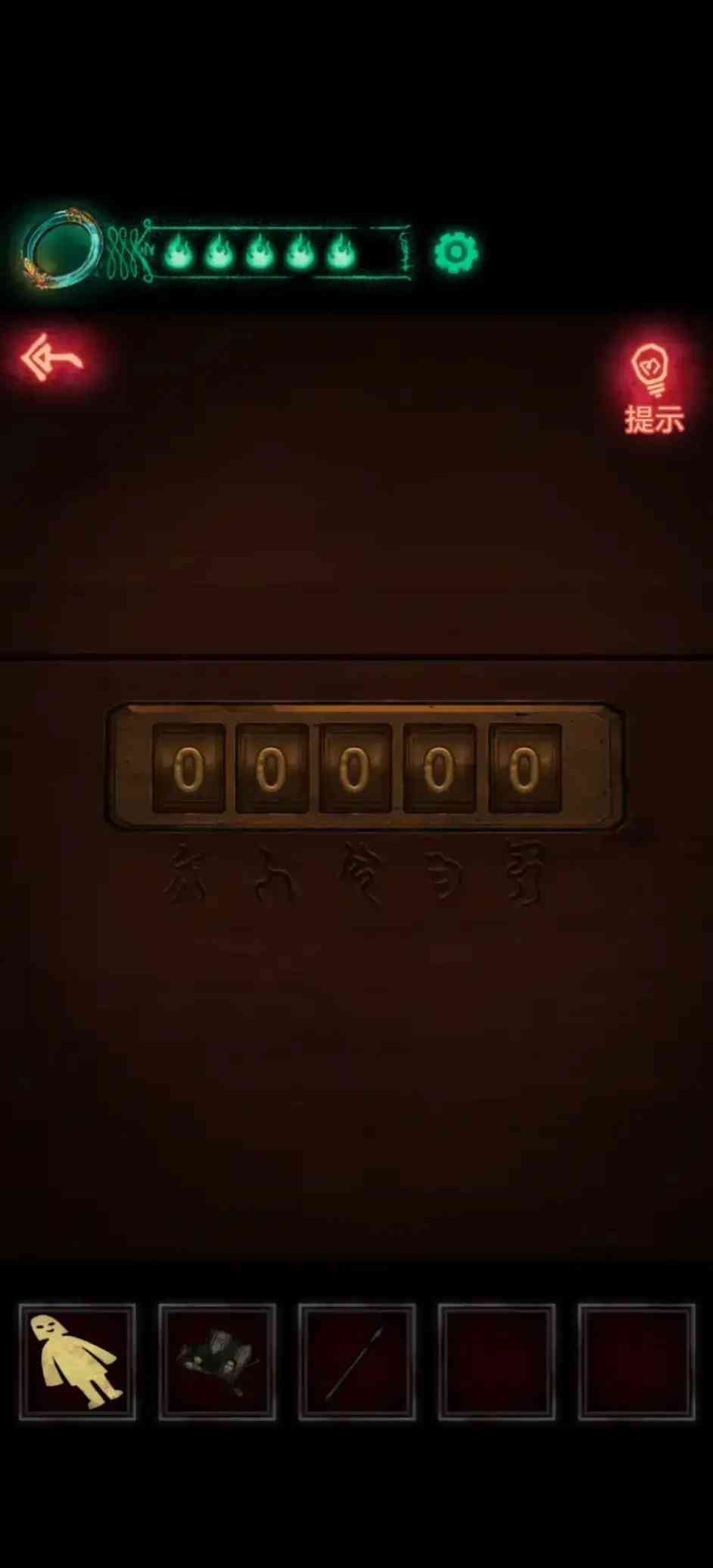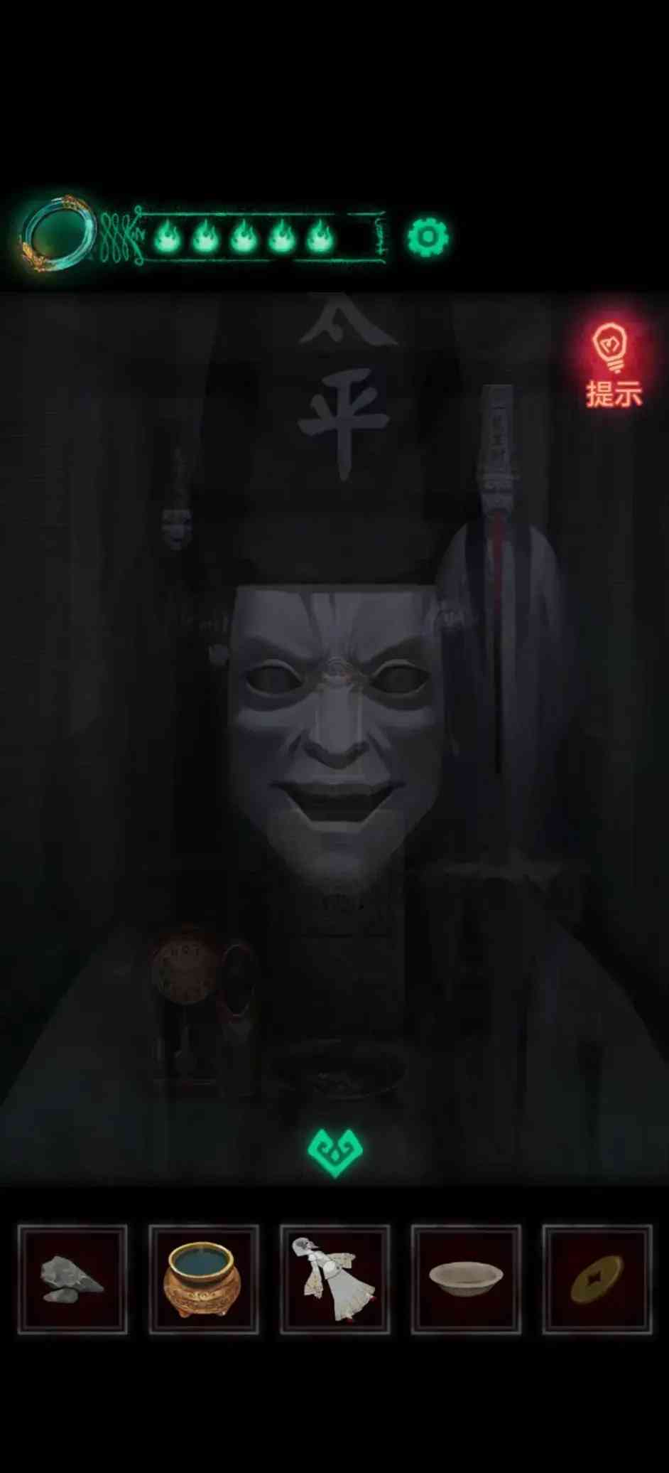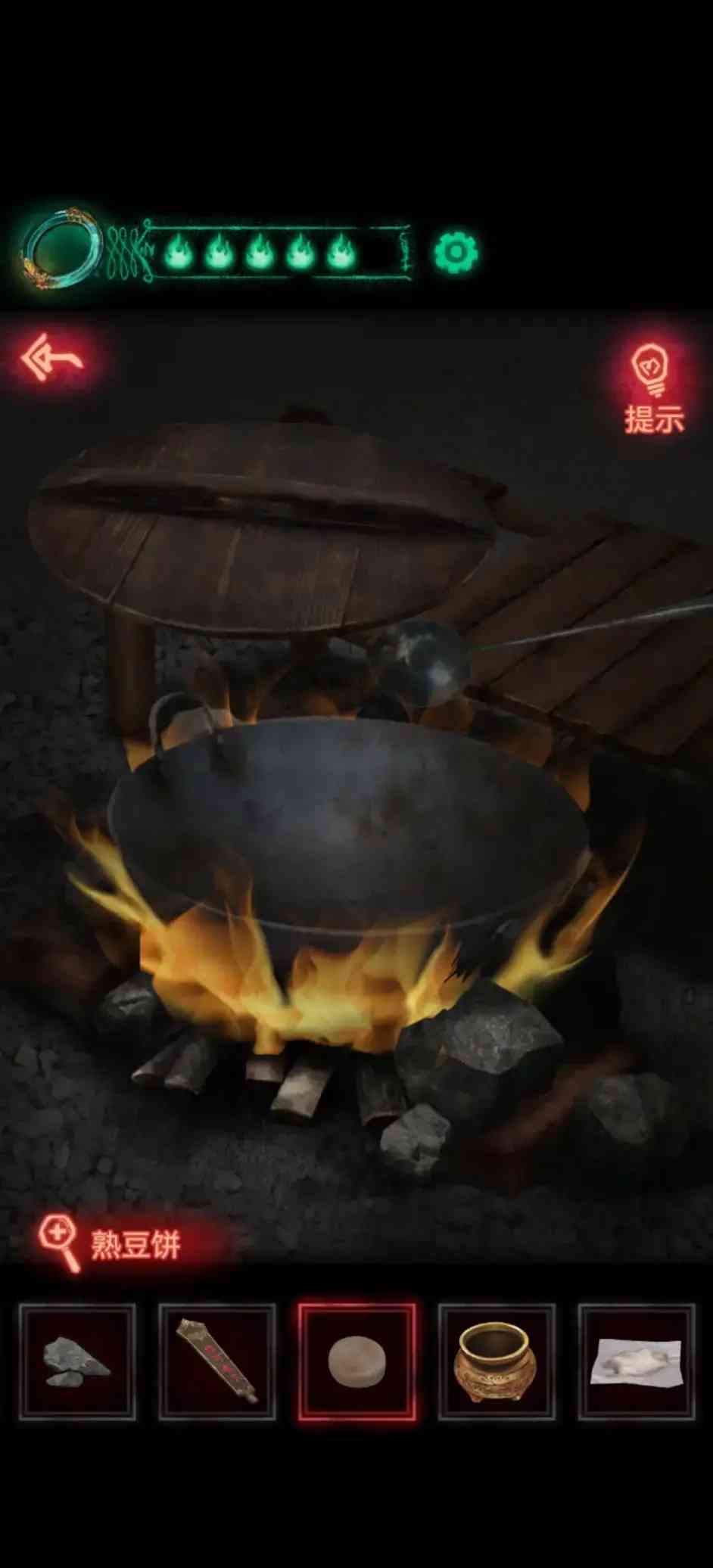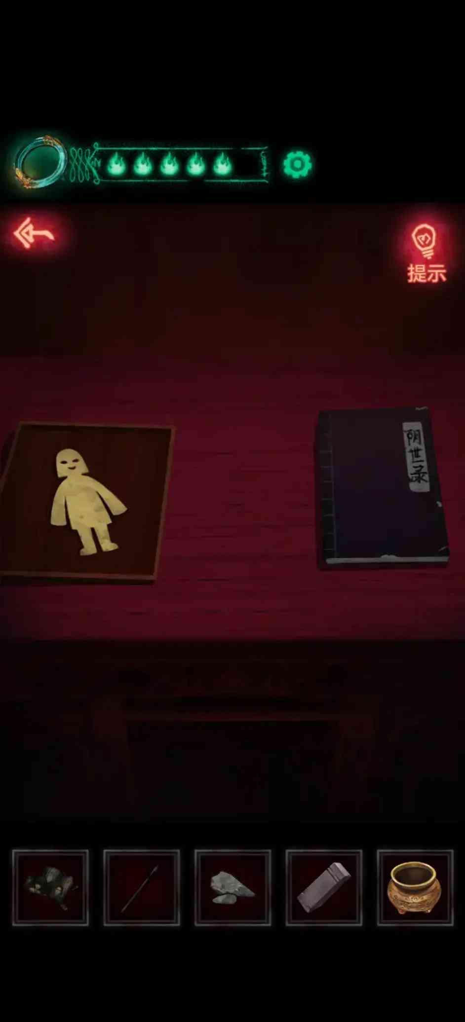 总之先拿起地上小方块,右边的告示板道具就齐了,结合刚刚我们推断的黑无常=水,白无常极=火,阎王=木,牛头=土,马面=金把木块调整好,之后机关打开露出后面皮影戏场景,左边书上写着“兮”=6。