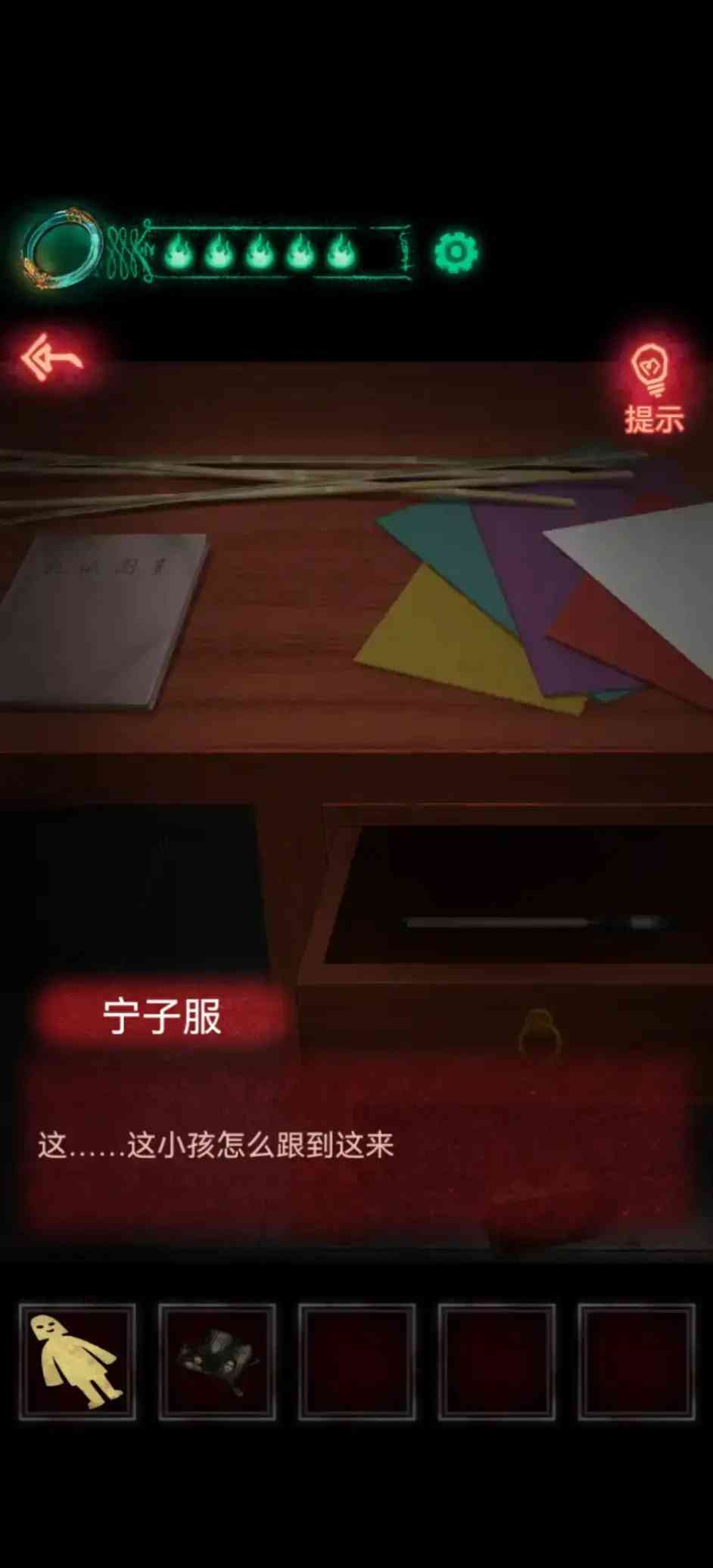 回到黑白无常场景,调整指针拿到符纸人,退出来再次写字,然而纸上自己出现了血红的冤,小纸人又又又被拿走了,这次连笔都被拿走了。