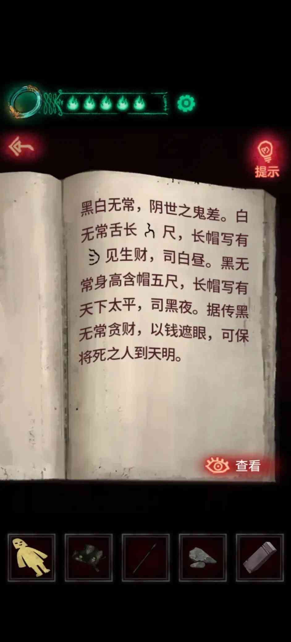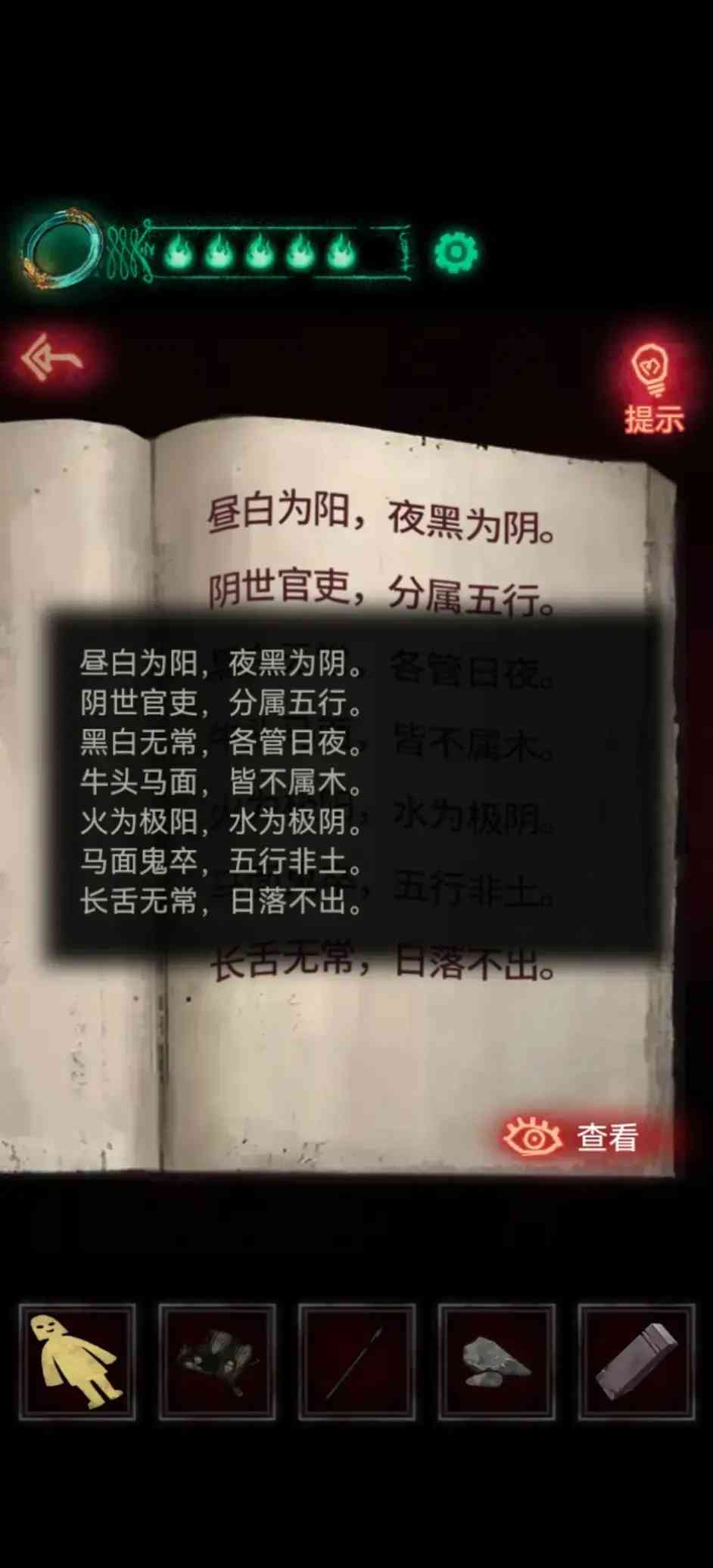 最后一页重点比较麻烦,白天是阳晚上是阴,阴官属于不同五行,其中黑白无常各管日夜,牛头马面不是木,火是极阳水是极阴,马面不是土,长舌无常也就是白无常晚上不出来。推理一下就是金木水火土其中黑无常是极阴也就是水,白无常极阳也就是火,马面和牛头都不是木那阎王是木,马面也不是土那牛头是土,马面是金。