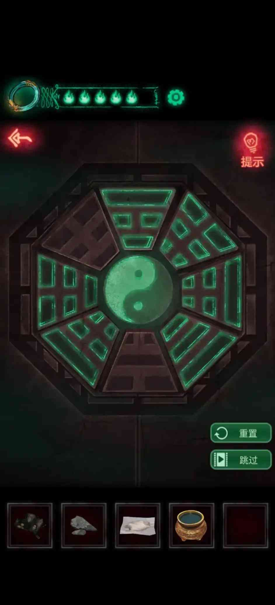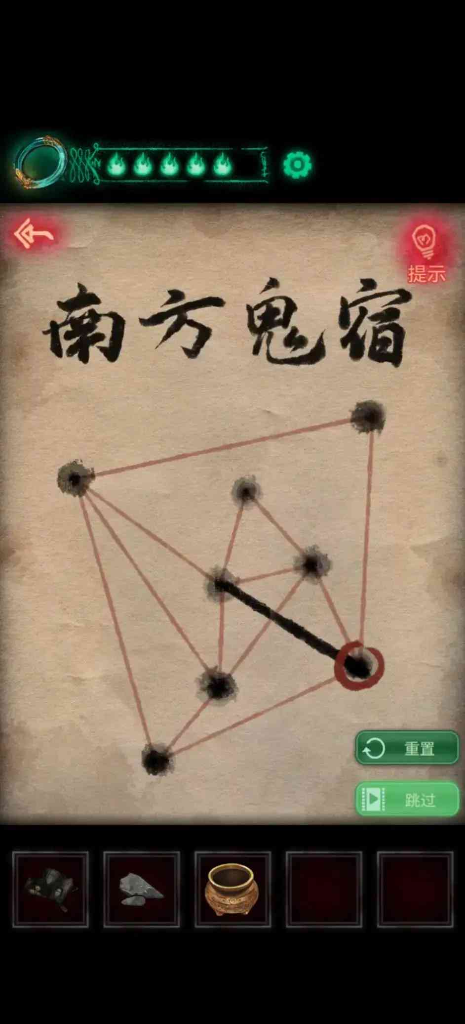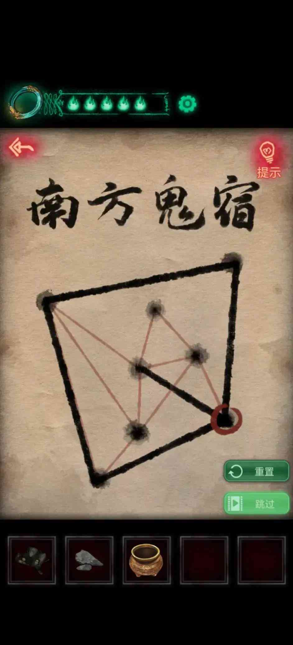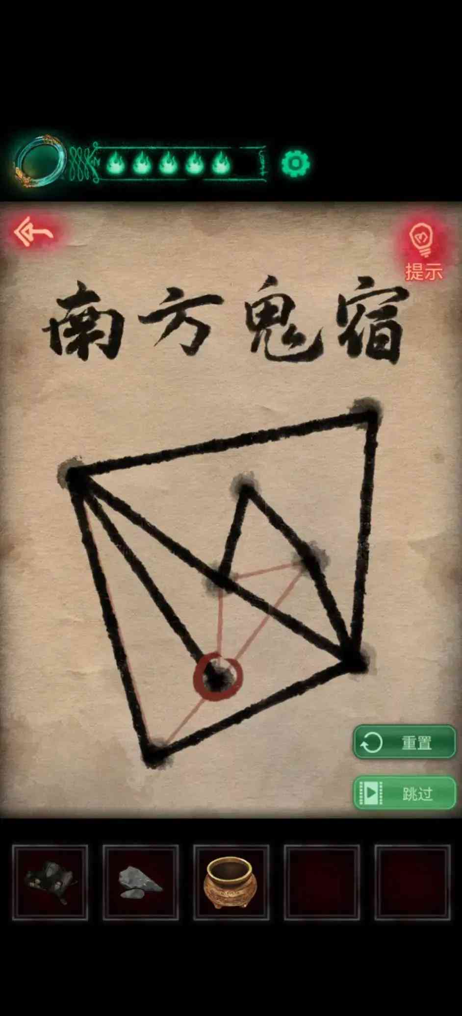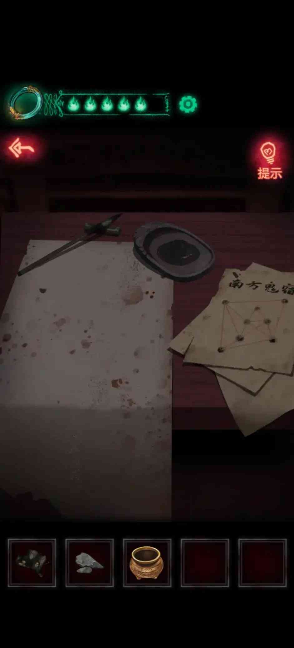 推理完了就可以拿走香炉把纸人放进去了,退出来用香炉在水缸取水,回来在笔架上放毛笔,在砚台里倒水放墨块,点右边鬼宿图玩一笔画游戏。