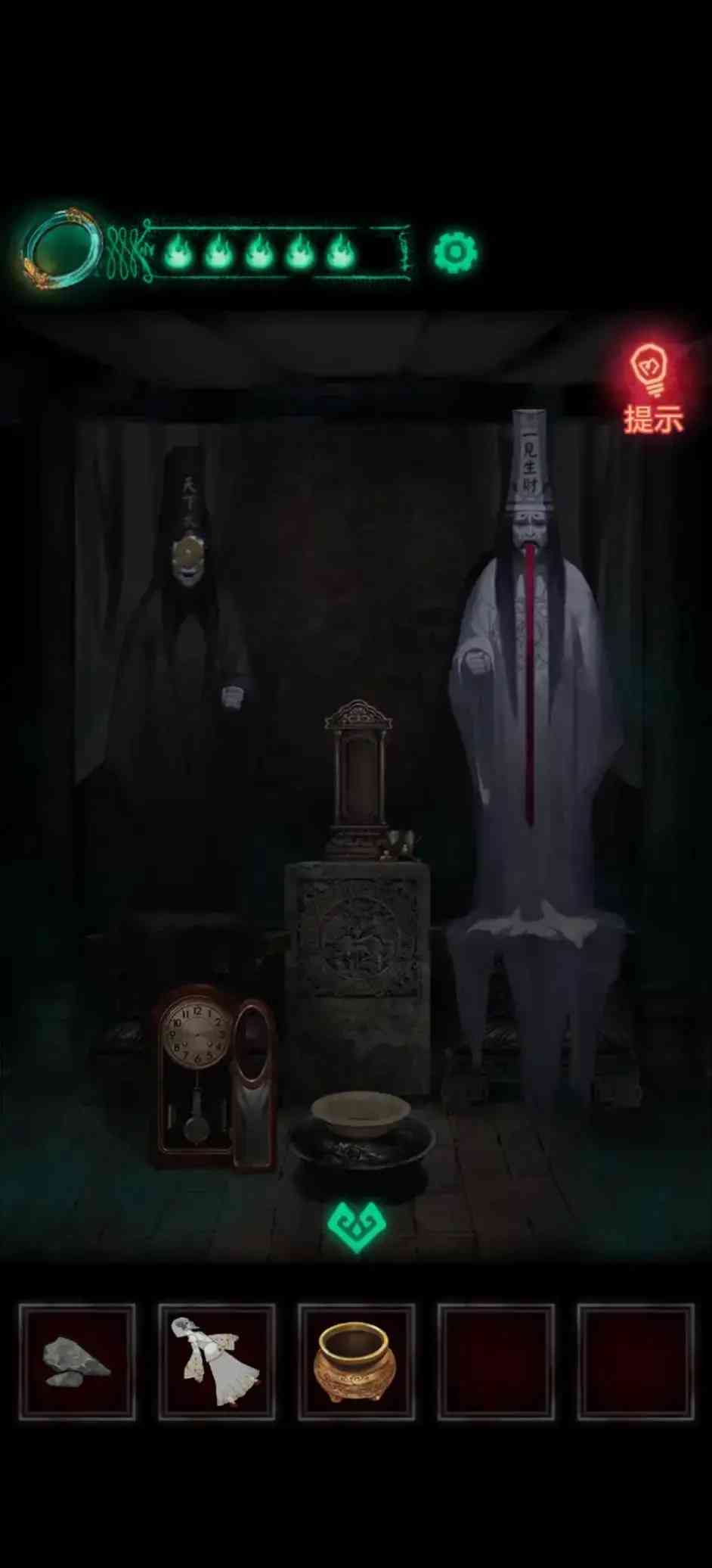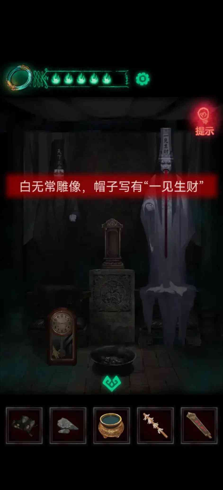 搜刮一下把两个无常手里道具都拿走,符纸人在钟表里暂时拿不到,这里可以看到白无常帽子写的是一见生财,所以“习”=1