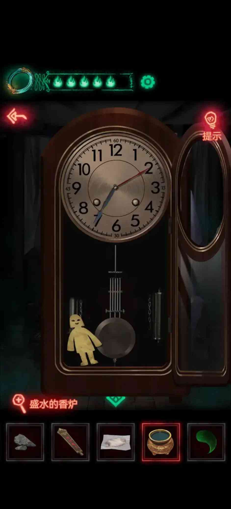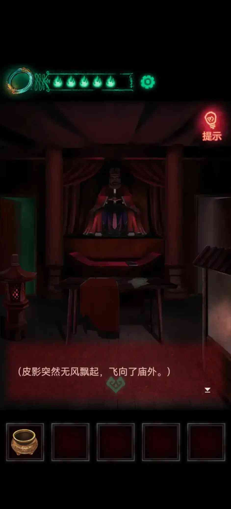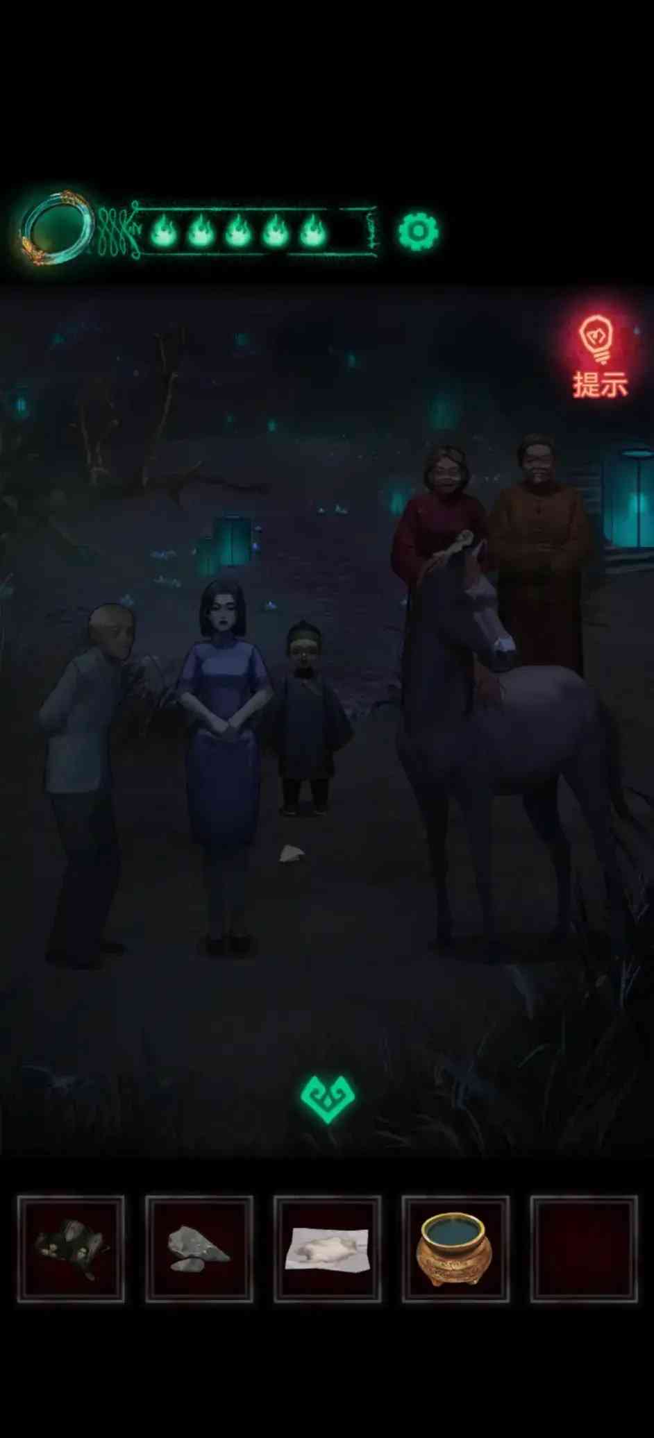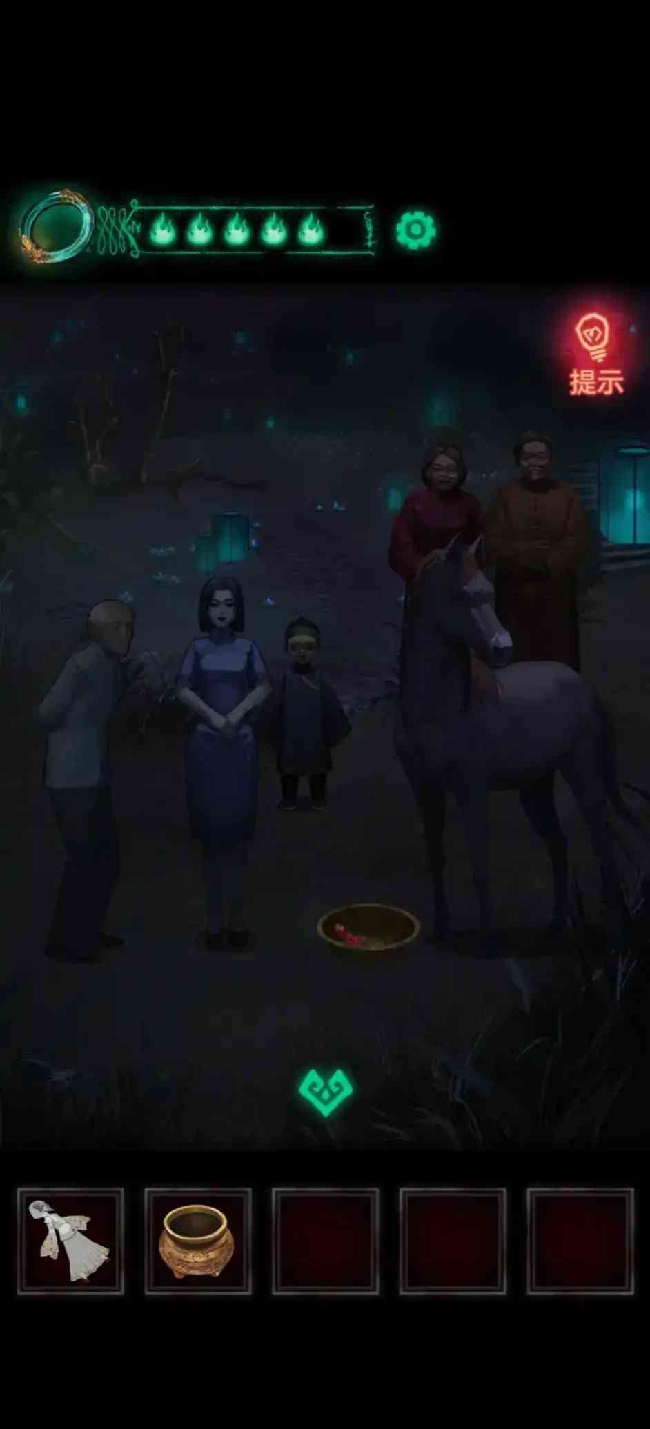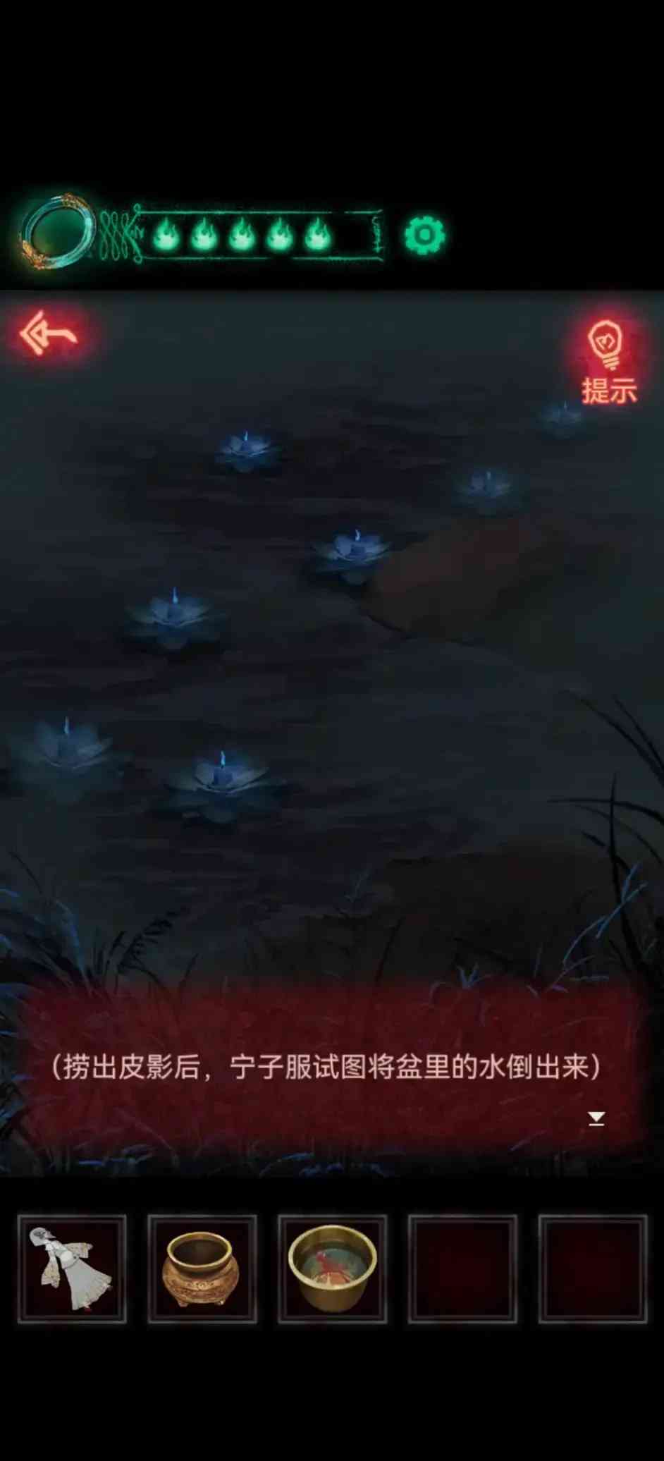 放照片,放纸盆,点火,回到阴间就能拿到盆了,然后用盆把红色皮影舀出来,但是盆里的水倒不掉,没关系回想一下之前线索说是马可以帮忙喝水,把盆放在马面前。