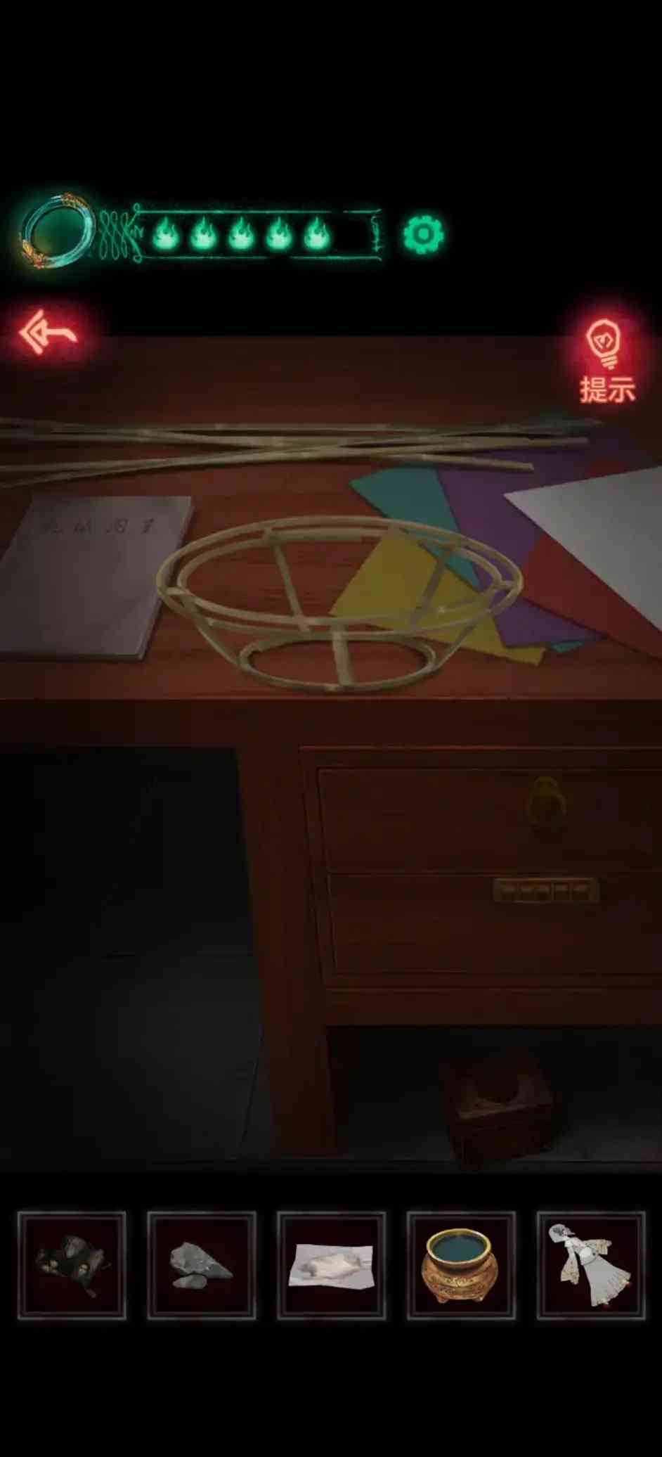 回头去贴纸盆烧纸去,这里注意退出来时候有小高能,退回第一个场景左边桌子点图鉴点桌子就能自动扎纸盆架子,扎好了把浆糊涂上就可以自动获得纸盆。
