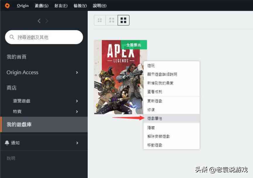 玩家先登录origin平台,在【我的游戏库】中选择apex英雄,右键点击选择【游戏属性】。