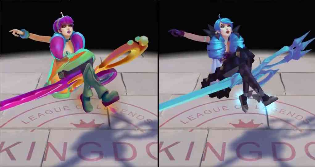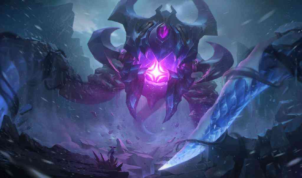 首先是黯晶系列的两款皮肤,塞恩依旧是一名纯粹的战士,铠甲以及武器全都是由蓝色的水晶锻造,额头、肚子以及武器的中间有紫色的宝石,紫色宝石像是能量的核心;维克兹的眼睛非常明亮,背景图中站着一个非常渺小的丽桑卓,对应了丽桑卓背景故事里的“深渊中看到的眼睛”。