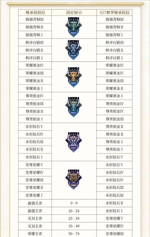 星耀段位继承:星耀一掉到钻石三、星耀二掉到钻石三、星耀三掉到钻石四、星耀四掉到钻石四、星耀五掉到钻石五。