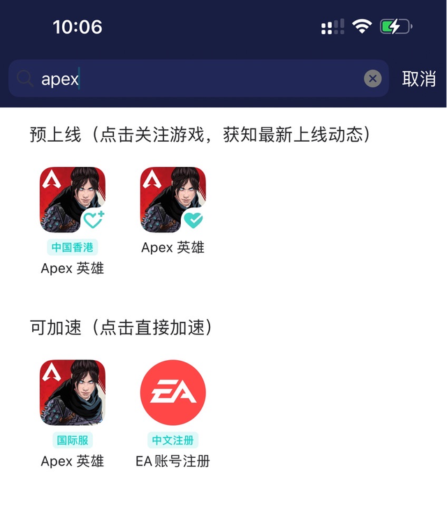 第二步:在软件内搜索Apex,会有两个图标,建议选“中国香港”,这进入游戏就会有繁体中文