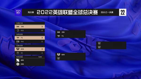 【CNMO新闻】10月23日,2022英雄联盟S12世界赛四分之一决赛DK对战GEN,双方鏖战打满了五局,最终GEN拒绝让二追三,3-2击败DK晋级四强。