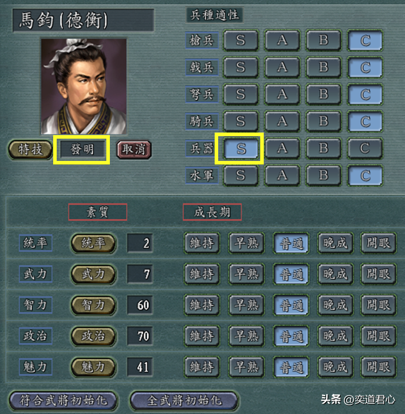 根据史书记载,马钧患有口吃的毛病,所以个人表达能力欠佳,这让他在游戏里的魅力值评估也极为受限。然而他却以一个S级的兵器适应性和发明特技,令任何一个看到他的玩家眼前一亮。