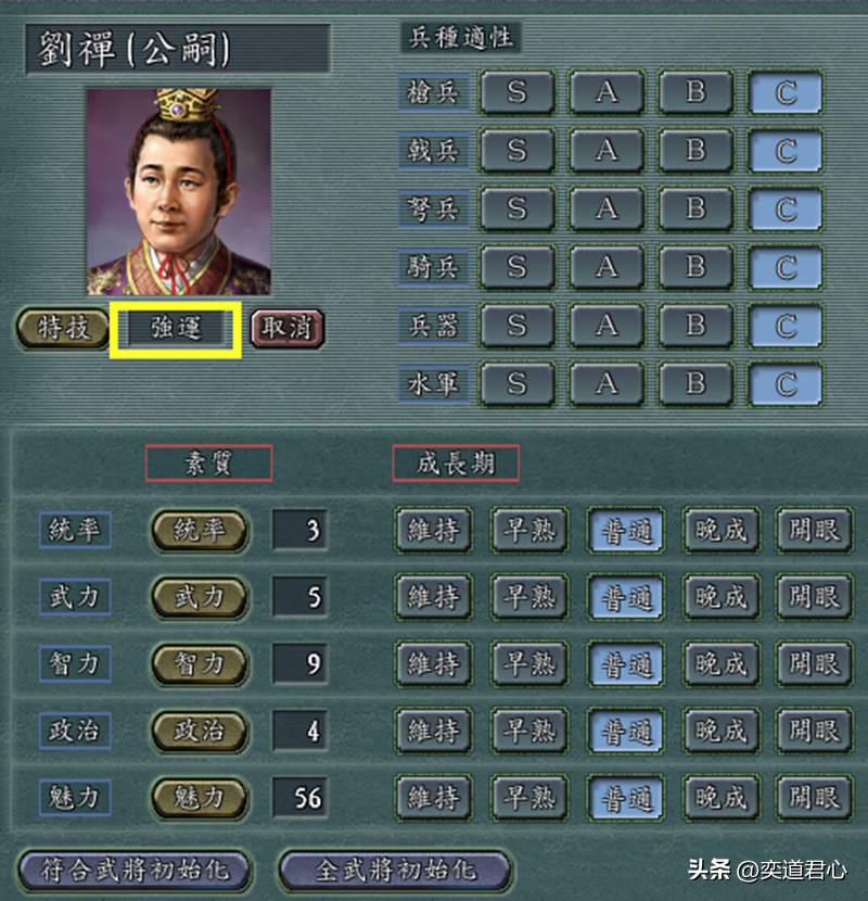 后主刘禅的入围理由就太多了,武力、内政和6C都是他在战五渣领域一条道走到黑的投名状。可说一千道一万,这个男人毕竟是有强运傍身的,虽然攻击弱得忽略不计,但是防御也是厚得深不见底啊!可惜了三国志11游戏只能带火,要是可以传播某种致命的病毒,刘禅不戴口罩去魏国跑上一圈,都没诸葛亮和姜维什么事儿了。