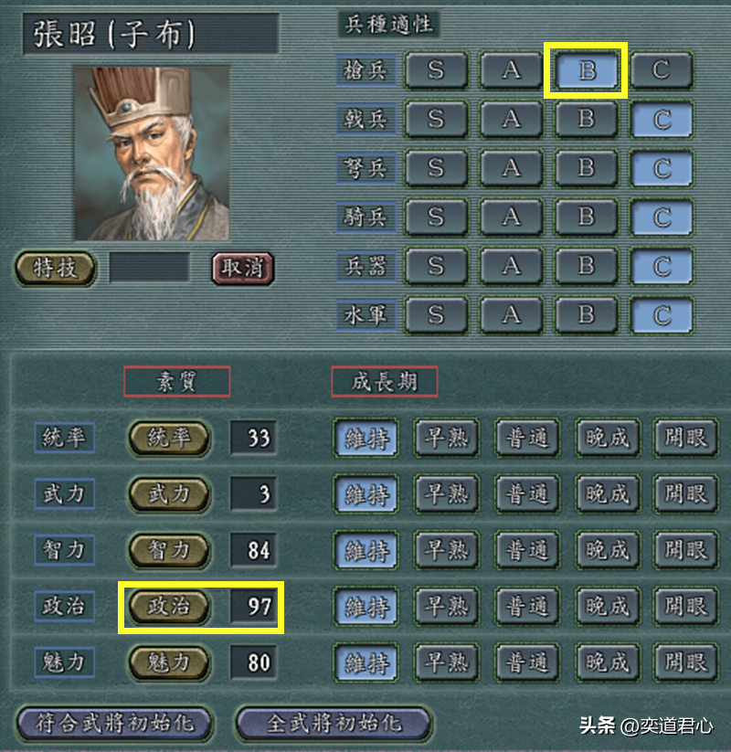 放眼整部三国志11游戏,张昭老爷子的内政能力都是最拔尖的,仅次于荀彧,位列政治榜单的全服第二。巧的是,第三名陈群的特技栏也是空空如也,只是他最差的能力并没有跌破5,不然入围的还多一个人。可塑性极强的张昭,能够配置论客技能纵横捭阖,也可以搭配能吏、筑城等技能,在后勤领域发光发热。