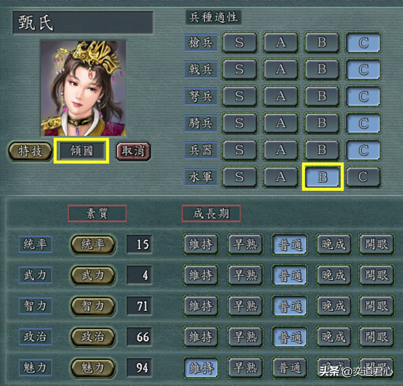 貂蝉没资格入围,因为她的统率值达到了10点,武力值更是“高达”26点,不算战五渣。看来跟对老公也很重要,即便貂蝉再是娇弱无力,她到底是吕布的女人。甄姬之所以武艺差,主要还是因为袁熙和曹丕的水平不高。当然这一切在倾国特技的面前都不重要,曹魏阵营在智谋领域本就没几个硬控,除了曹操、何晏之外,也就属甄姬。