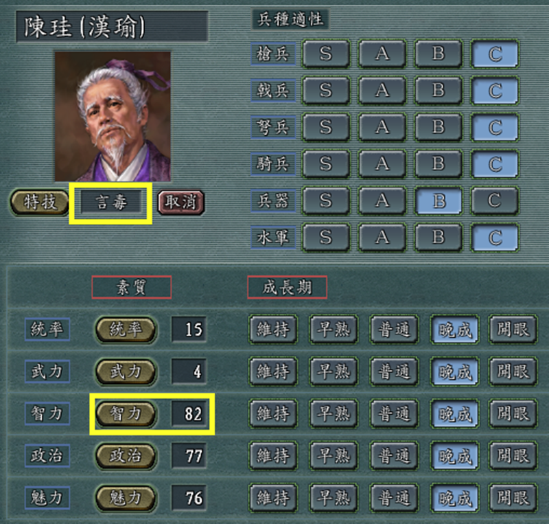 掌握言毒特技的陈珪,是初始智力最高的“毒舌男”。能够三言两语把对手都喷退的绝活儿,使得人们都不自觉地忽略了他的武力值只有4点。可惜陈珪的登场时间线相较于他自己的真实寿命来说太短了,因此只能在英雄集结这样的寿命假想模式里才能充分彰显其功夫。