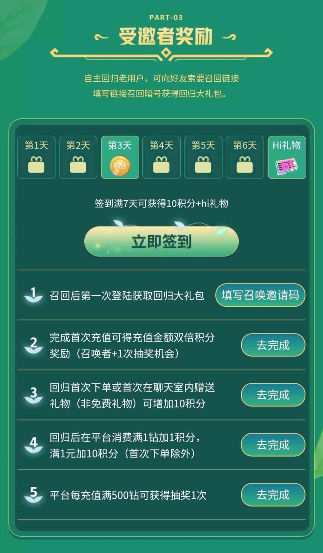 而回归用户不仅可以领取回归礼包一份,而且还有惊喜奖励,不仅充值就送抽奖机会,而且还有七天签到回归礼,同时回归用户下单或在聊天室内赠送礼物,均可获得额外积分。自主回归的老用户,也可以向好友索要找回链接,填写召回暗号,也可参加活动,获得回归礼包哦。