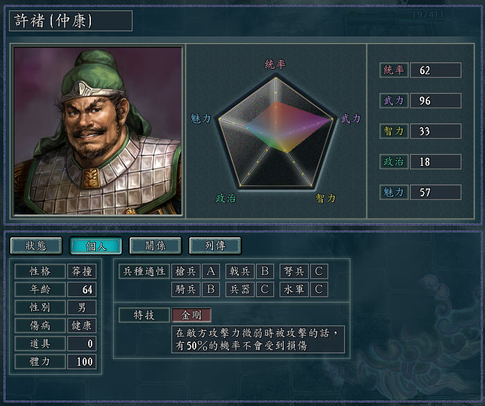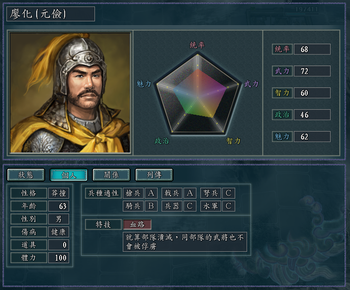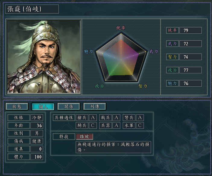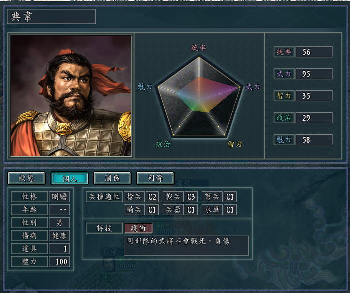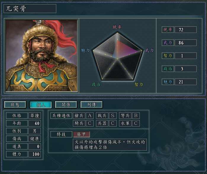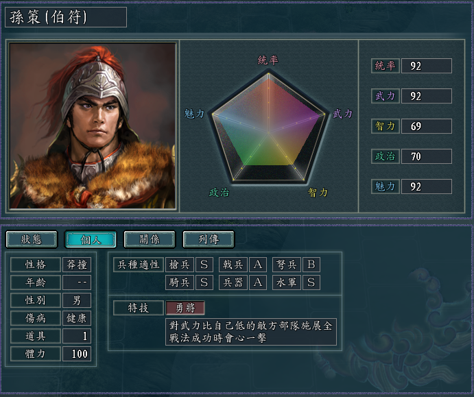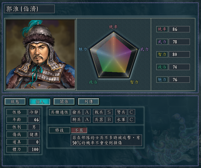 几个自带“不屈”特技的武将,戟兵的适性都很高,而且统武也都不错。