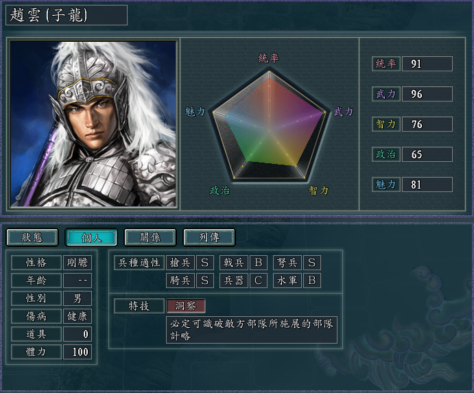 赵云的特技“洞察”本身又相当于魔免,他自己一个人就已经是很难处理的存在了。唯一的美中不足,是赵云的戟兵适性比较低。