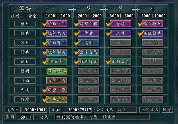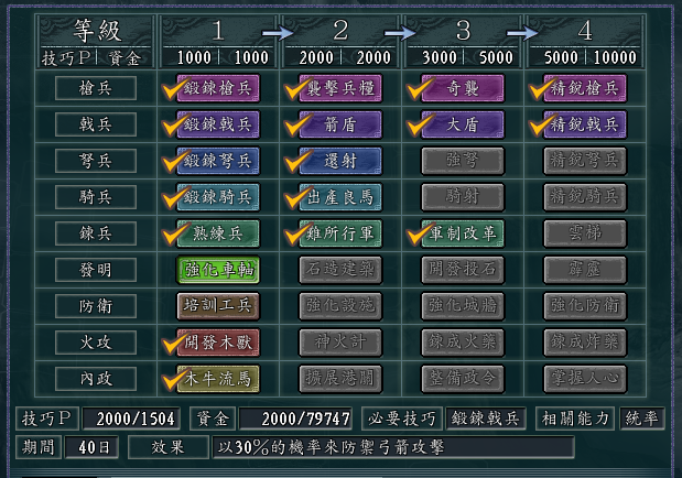 这个组合,再带上戟兵的话,戟兵本身的防御系数就是最高的,而且二、三级科技,分别可以对弩兵和其他一般武力攻击造成概率抵挡,自然是防御兵种的首选了。