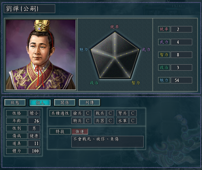 “强运”特技,只有刘禅一个人拥有,不会战死被俘和负伤,效果更强,但是只针对持有者自己一个人。