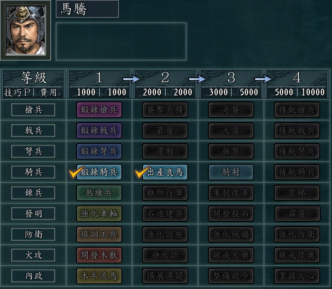 再来看科技研究,其实游戏也已经预设了马腾势力懂得【锻炼骑兵】(提高骑兵战法威力)和【出产良马】(增加骑兵的移动力),给了足够的提示。那么开局建议先研究通用类的【熟练兵】(气力上限100→120,可以使用更多战法),然后骑兵类的【骑射】(骑兵的放风筝打法,而且可利用马腾家彼此关系好触发更多连携攻击) - 骑兵类终极的【精锐骑兵】(提高骑兵攻、防、移动)。之后再看情况决定后面的研发路线。