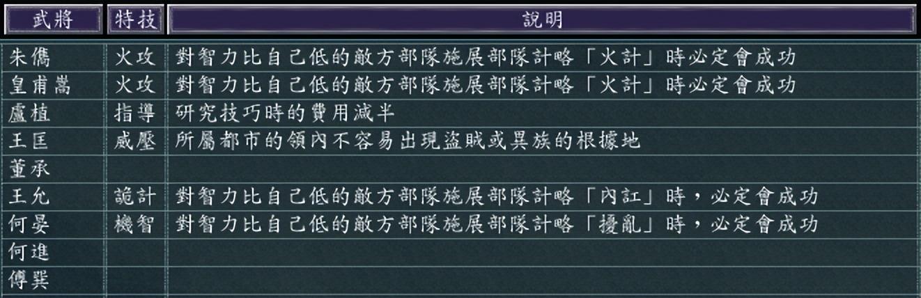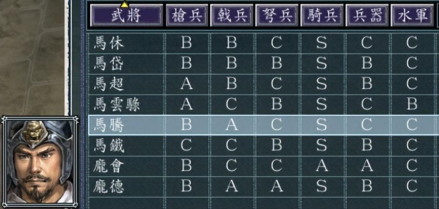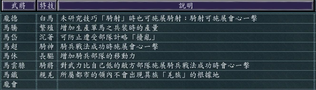 除了适性,我们还可以看武将的特技,马腾的【繁殖】从内政上加速生产“马”这个兵装,马休【长驱】增加骑兵的移动力,马超【骑神】和马云騄【骑将】都是用骑兵才能产生会心一击。因此确定走骑兵路线无疑了。