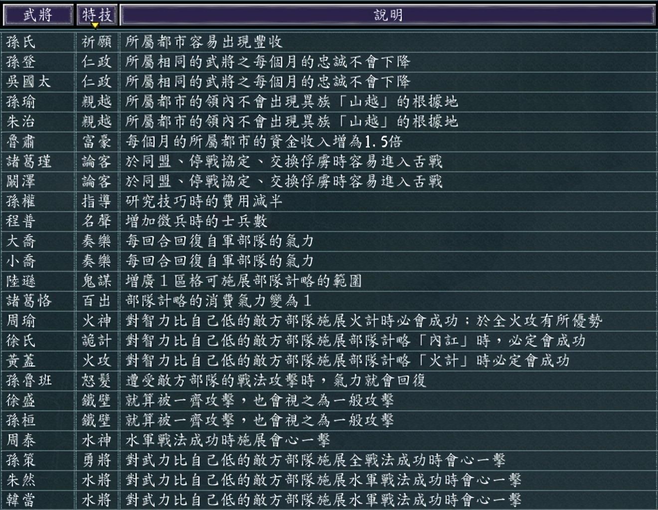 以孙家势力为例,他们家枪兵、戟兵、弩兵都有不少S,骑兵比较少将领精通只有孙策适性S且特技【勇将】适合骑兵。
