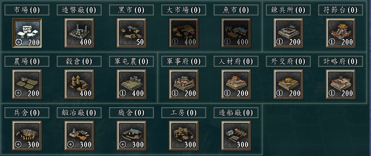 在三国志11威力加强版中,市场、农田、兵舍、廊舍、锻冶场这五种建筑都可以升级到三级(上图中,图标左下带+号的)。