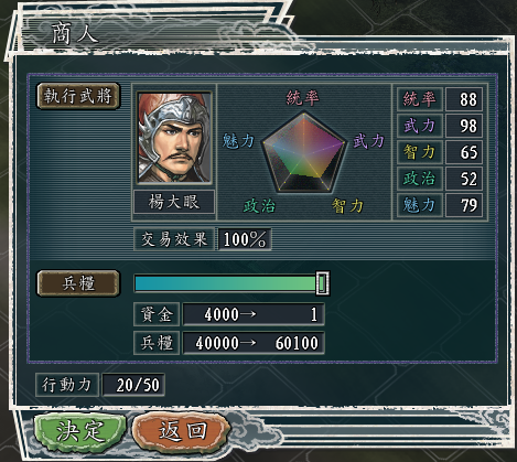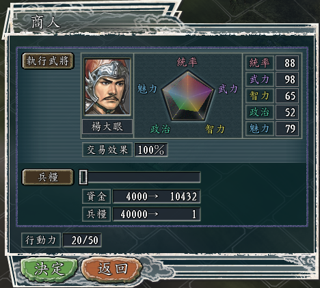 比如上图,当前城市的钱粮比例是中间价1:5,可以看到,4000资金差不多就是换了20000军粮。