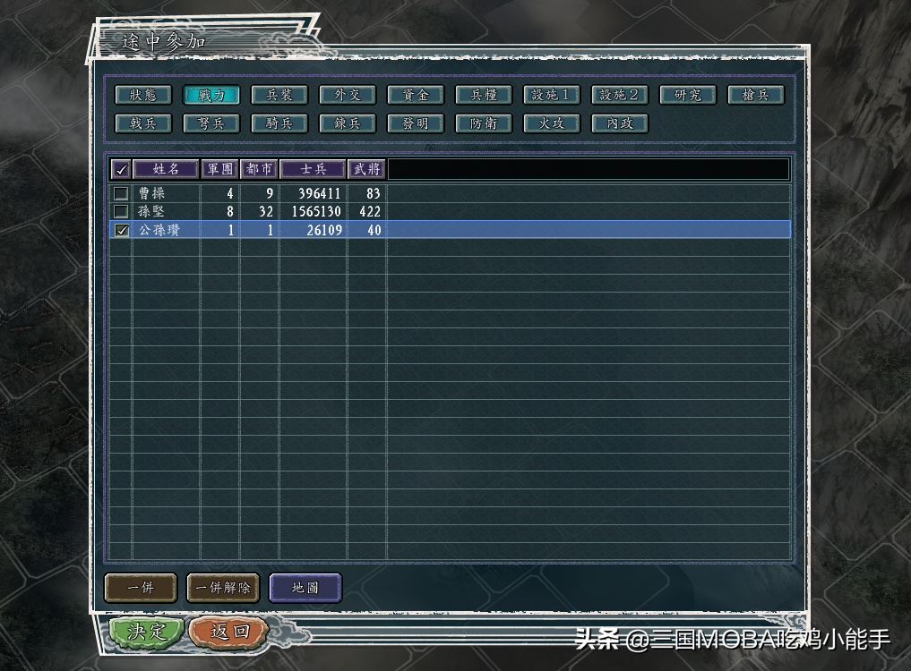 很多老玩家在挑选势力的时候,基本都会主动排除选择曹刘孙这样的大势力,确实没啥挑战,人才多,地盘大,轻轻松松就能碾压周围的对手,吞并周边的势力和一统天下的效率也会明显加快,选择剧本下的大势力确实很难有翻盘局的体验感。而开局选择小势力,难度虽然直线上升,却明显紧张刺激,每一步都像下棋,不容有失,操作感也更加强一些。