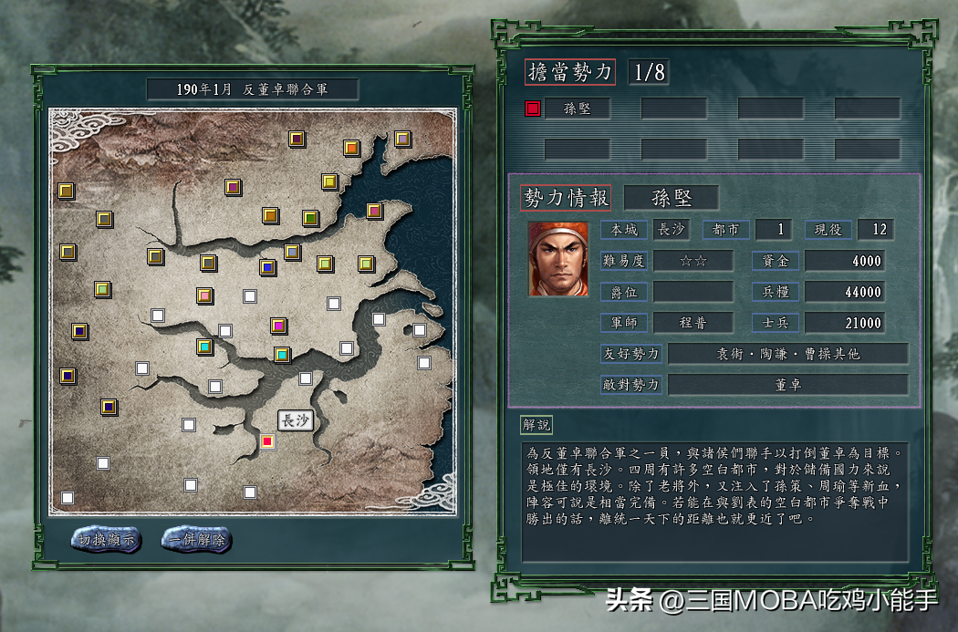 比如《反董卓联合军》中,孙坚竟然位于遥远的长沙,周围全是空白都市,极易快速扩张。再比如《群雄割据》中,孙策是位于庐江,北方有盟友袁术挡着,南方却都是零散的小势力,特别容易吞并和做大。可以看出,孙吴的地理位置是非常轻松的,远比刚创业的刘备和曹操轻松。