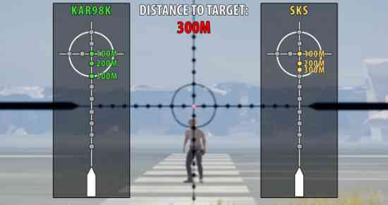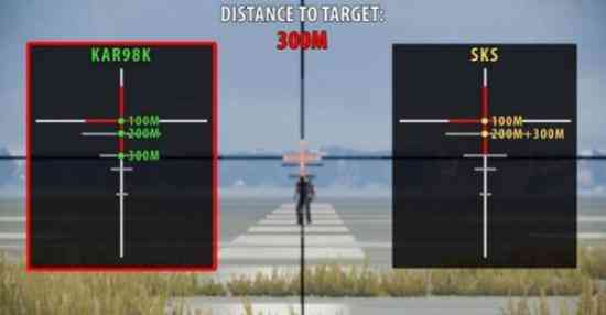 300m:人物略窄于四倍镜98k300米准线,八倍镜300米瞄点(圆圈下部)到腰
