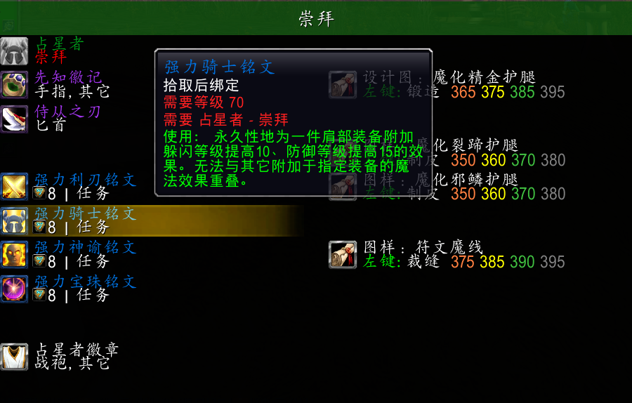 防骑很适合奥尔多提高15点躲闪等级的强力护卫铭文,因为在P2阶段防骑的防御属性虽有所提升,但是远远达不到及格的程度,所以能够提高躲闪属性则是最佳的一个选择。奥尔多的肩膀附魔对于防骑来说提升很大,不用考虑其他的肩膀附魔,满级以后直接把声望冲到崇拜换肩膀附魔就是对的。
