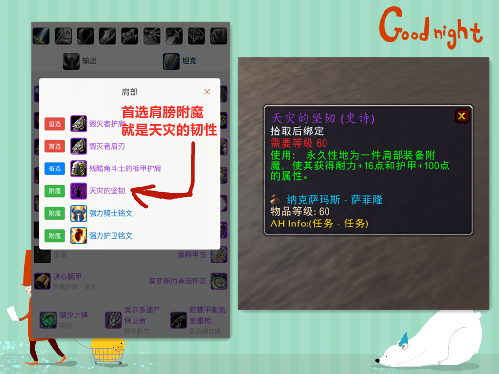 P2阶段防战和熊T玩家都直接忽视了TBC的肩膀附魔,把选择的目光看向了上个版本,也就是NAXX里的防御肩膀附魔一一天灾的坚韧。坚韧附魔加16点耐力和100点护甲,首先耐力和护甲对于熊T来说简直是完美,是熊T迫切需要的最好肩膀附魔。而对于防战来说也是同样的道理,耐力和护甲是P2阶段优先的选择。