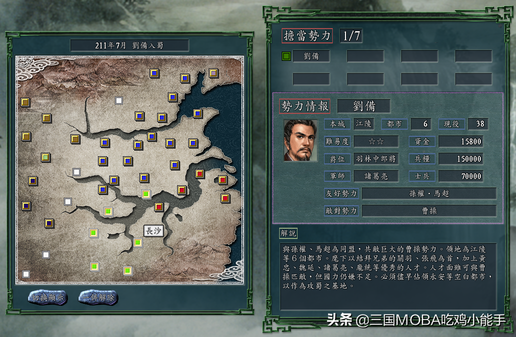 游戏里有刘备势力的剧本是有挺多的,而且不同剧本中的刘备难度都不太一样,难易度波动幅度很大,而在前期剧本中,刘备势力人少,城池小,萌新玩家操作起来还是挺有压力的,很难把握得住,这里建议还是尽量选择中后期剧本里的刘备,从211年《刘备入蜀》开始的所有剧本中,刘备势力的操作难度有明显降低,手下有一大堆能臣猛将,而且还有强援孙吴,操作起来真的非常的简单。