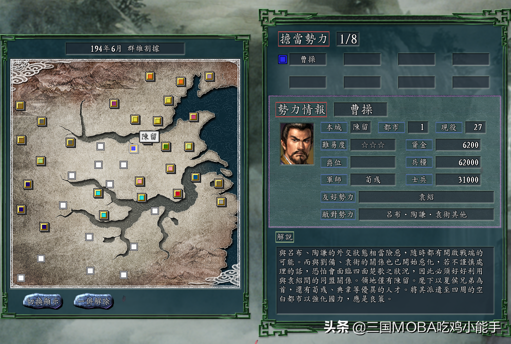 游戏里虽然有很多剧本曹魏都特别强,城多将广,但个人认为不适合新手去操作,因为玩起来会非常复杂,很多城池都需要玩家去操作,很有可能兼顾不过来,如果委任给电脑,更容易翻车。对此,个人认为194年《群雄割据》的曹操势力其实就特别适合萌新,原因主要有四点: