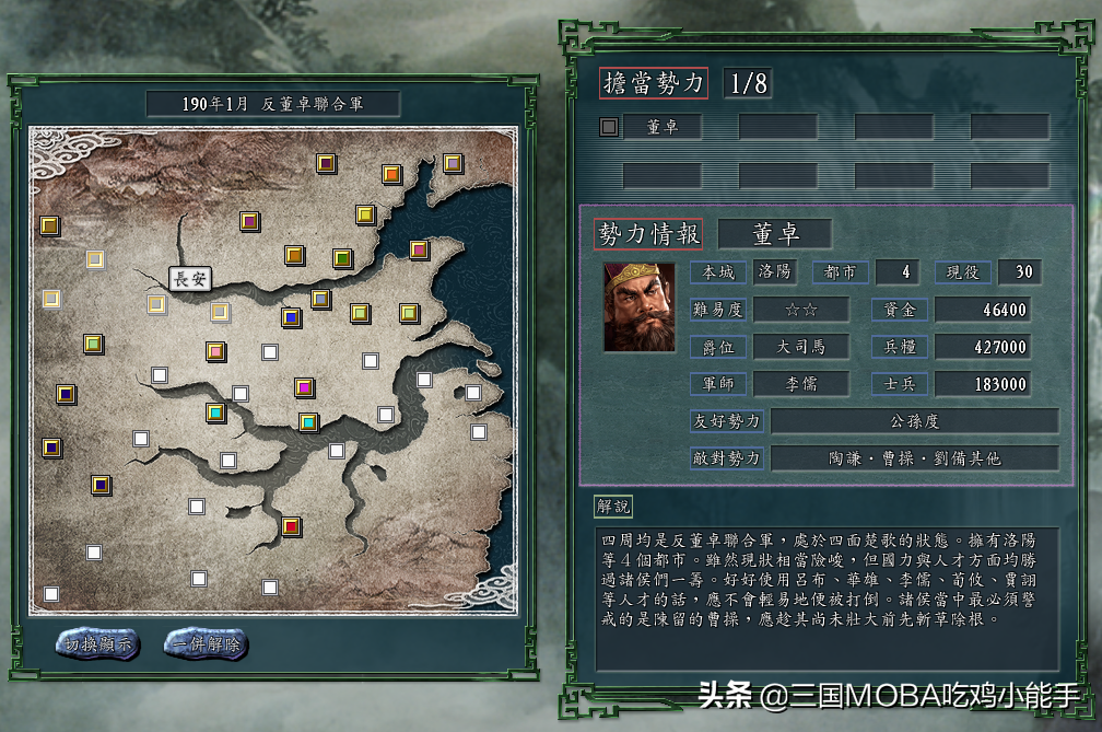 游戏里董卓最高光的时刻,无疑还是要数《反董卓联合军》剧本里的时候,虽然这个剧本中董卓树敌无数,特别容易被围殴,但是实力实在是太过强大了,不仅有众多能臣猛将,比如,吕布,华雄,张辽,贾诩和李儒等等,而且开局的兵力资源就极为丰厚,几乎都是任何势力的10倍左右,也更是碾压周边所有的势力,玩家开局完全可以不发展内政建设,直接带兵吞并相邻的曹操,袁术等等势力即可,真的非常简单无脑。